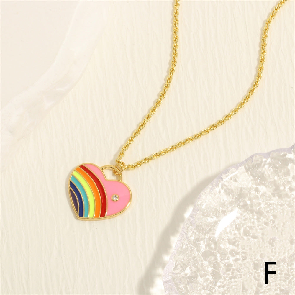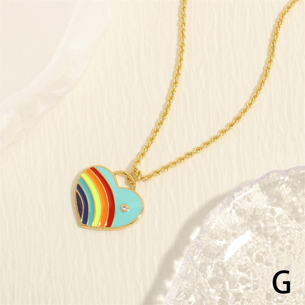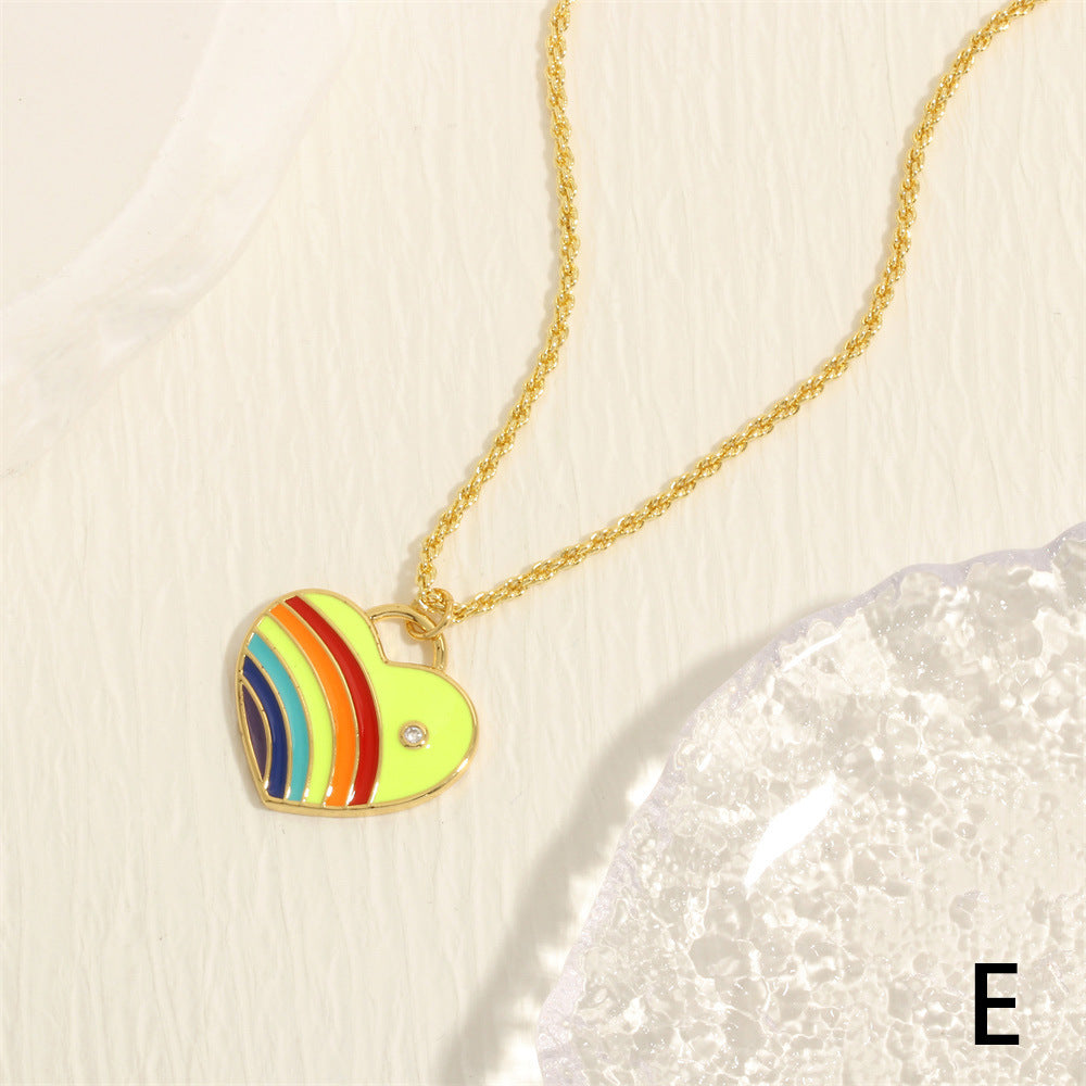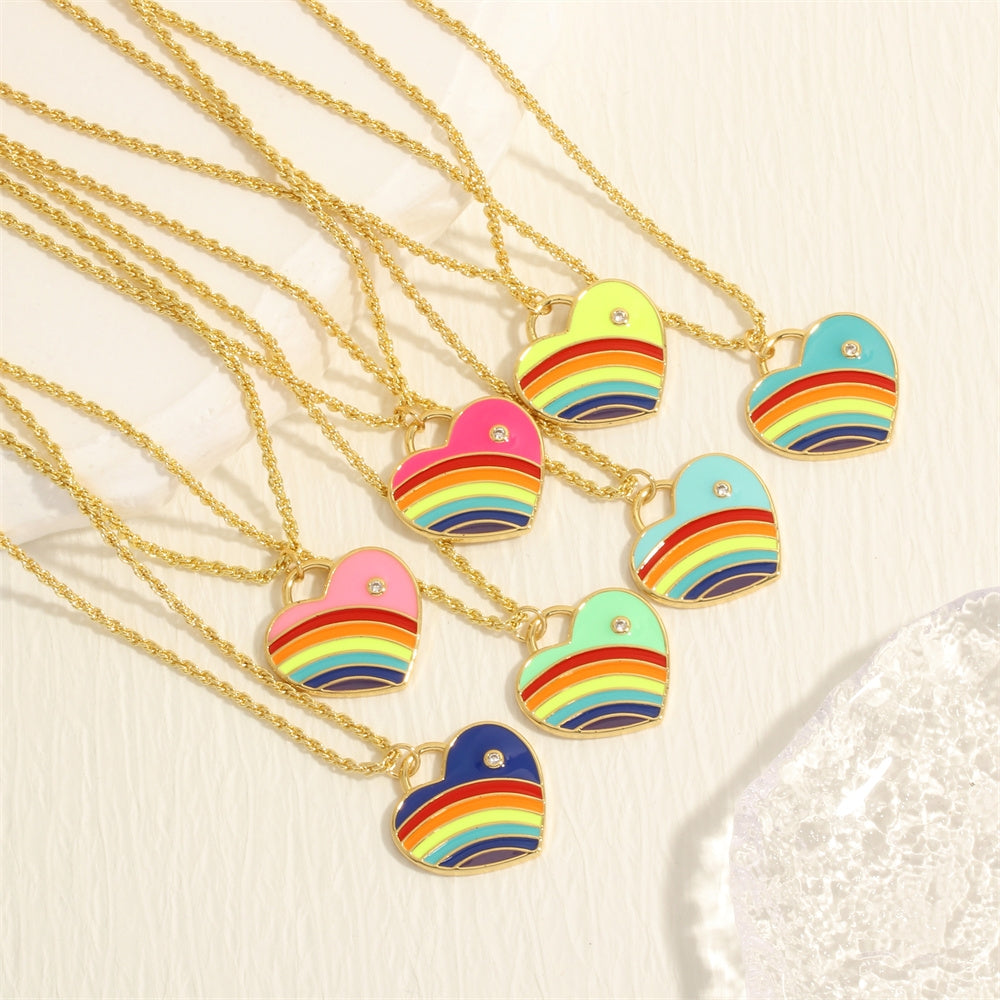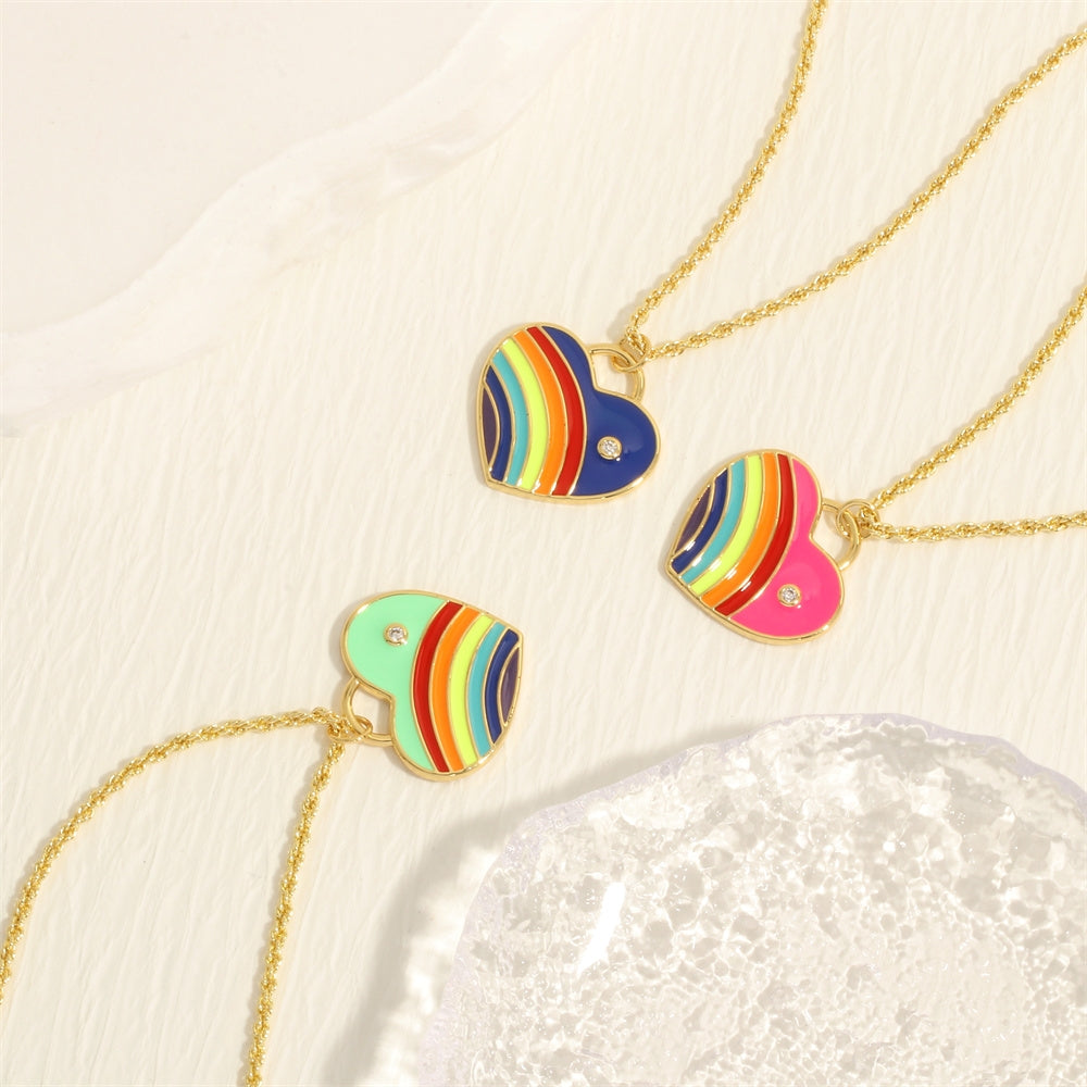 Simple Heart Shape Rainbow Enamel Zircon Pendant Necklace 18k Gold Plated