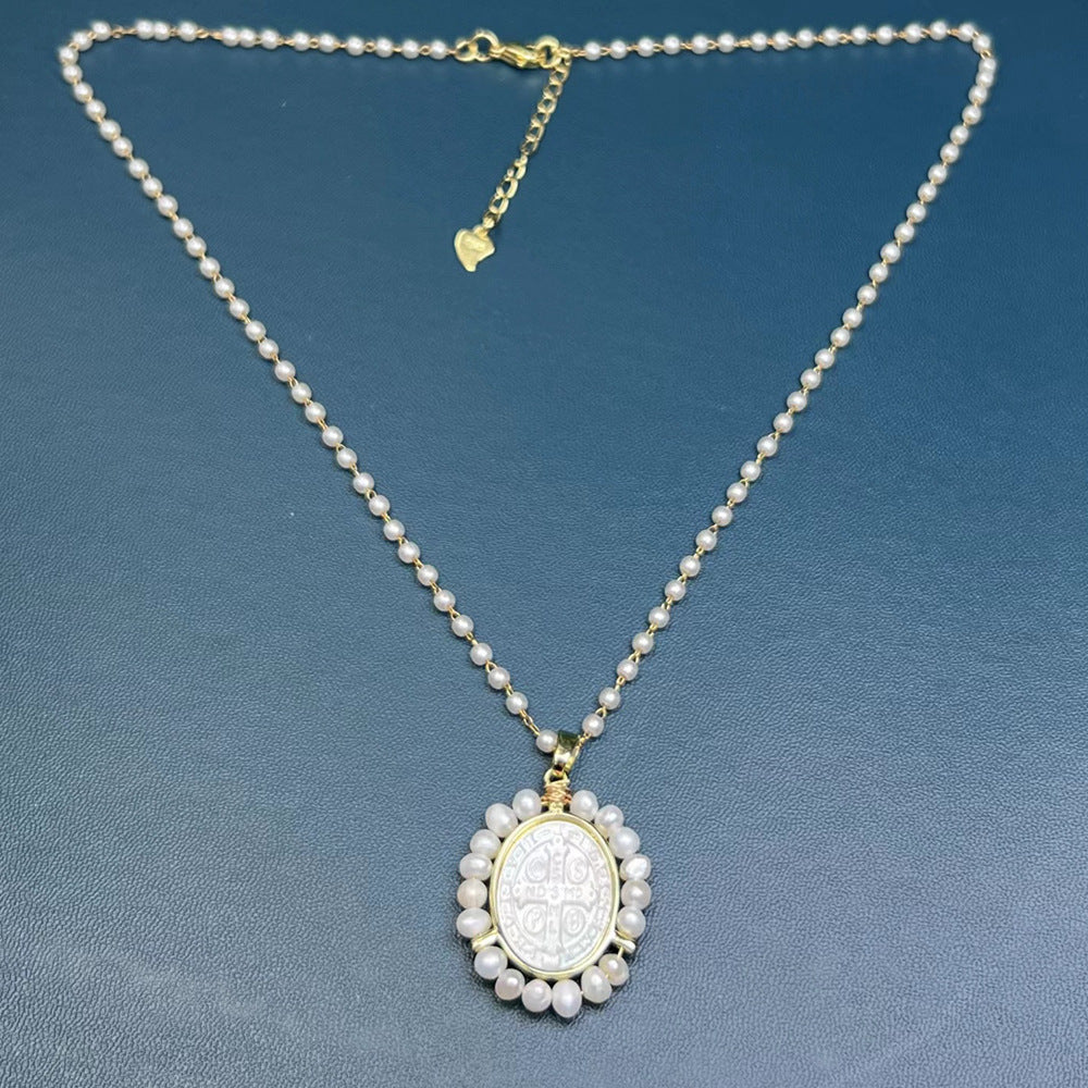 Simple Oval Imitation Pearl and Mother of Pearl Cross Pendant Necklace for Women