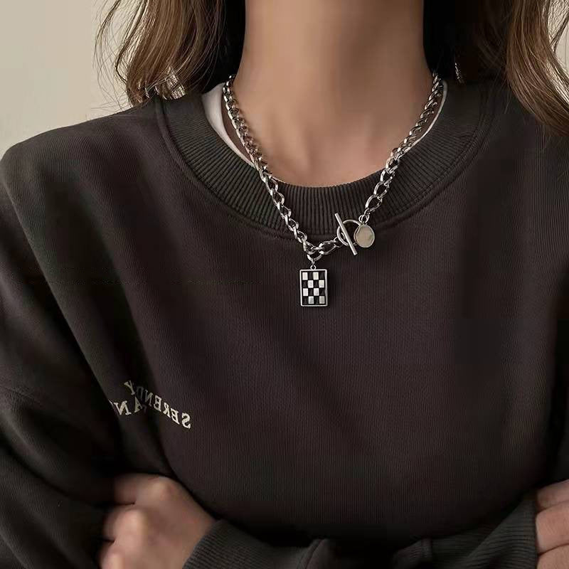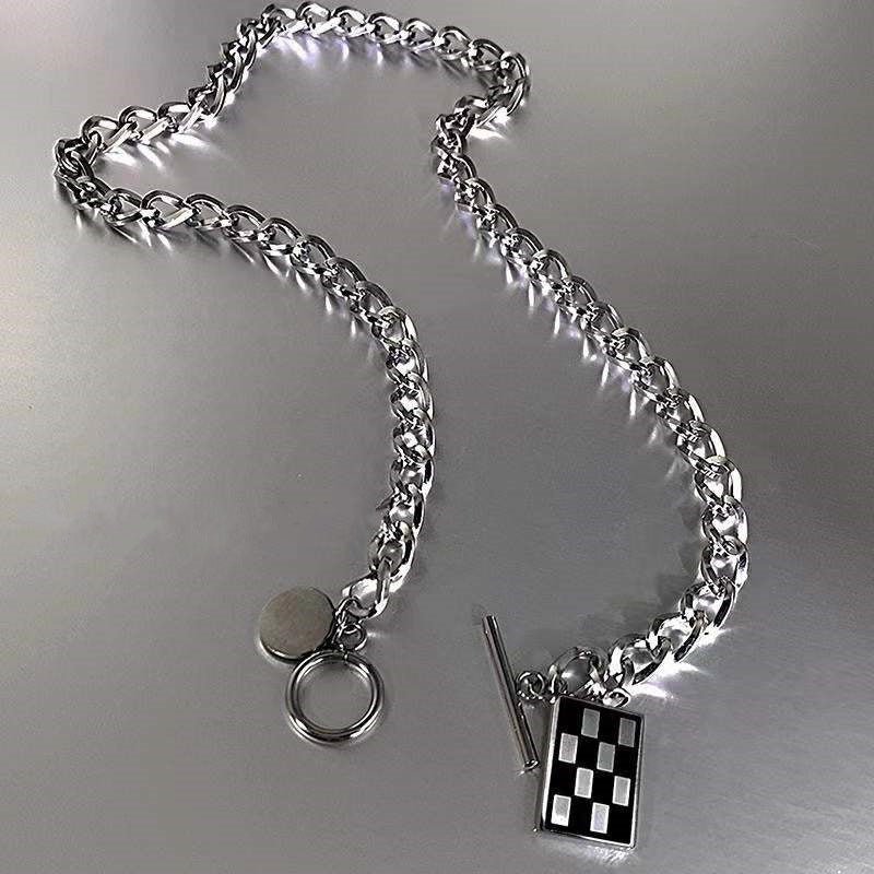Square Black and White Checkerboard Geometric Pendant Titanium Steel Necklace