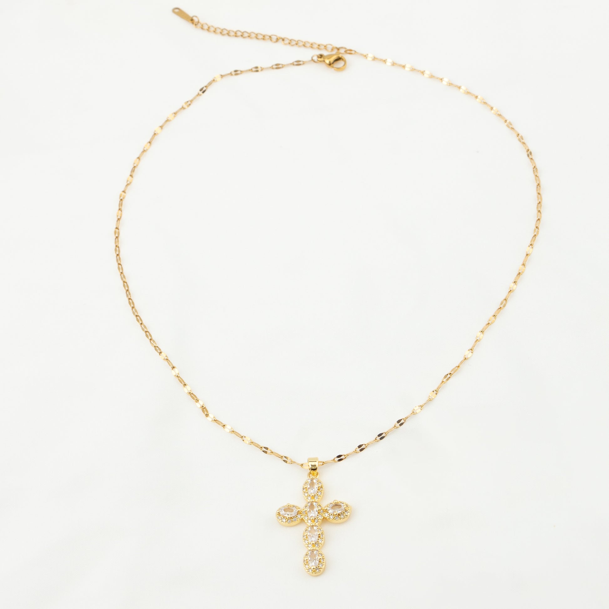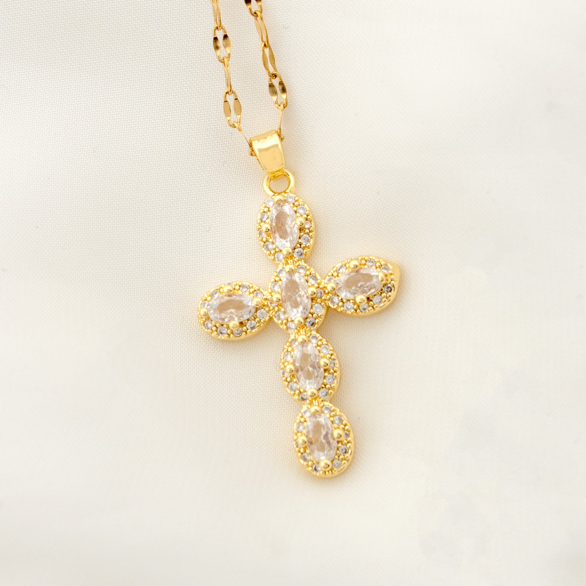 18K Gold Plated Vintage Geometric Cross Pendant Necklace with Rhinestones and Pearl Zircon