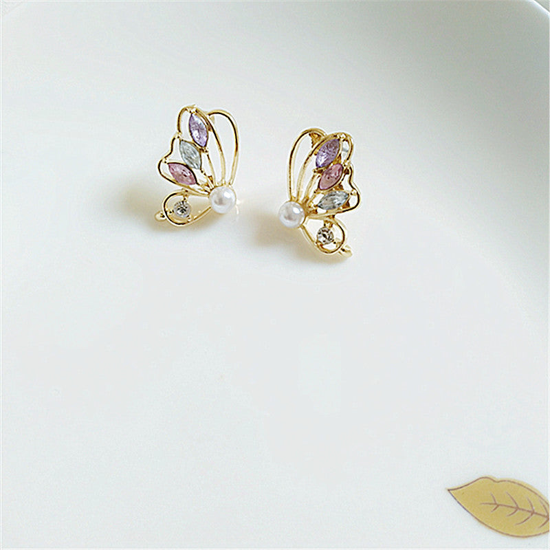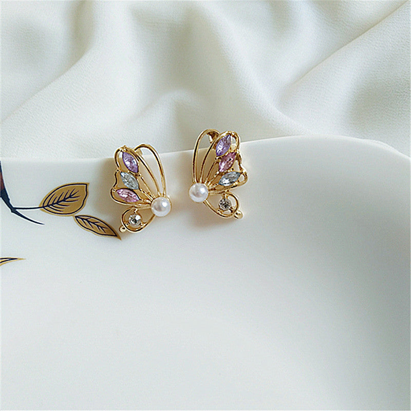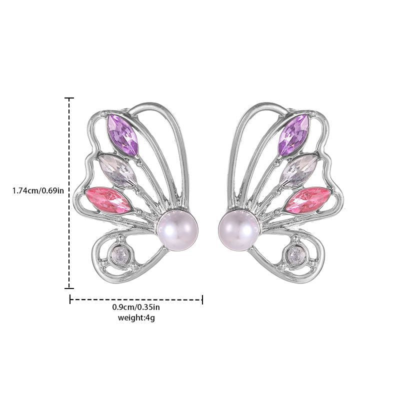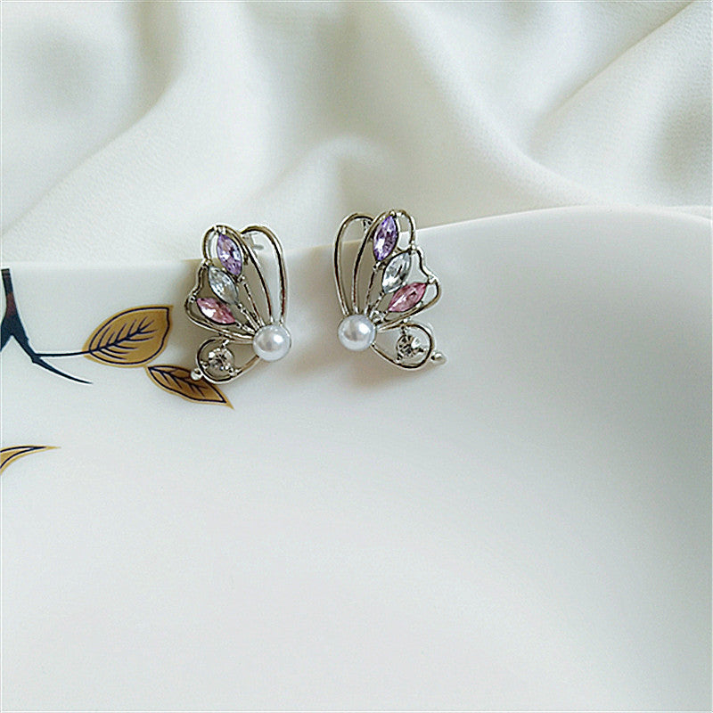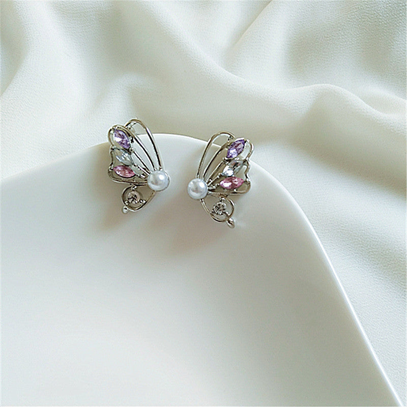 Sweet Butterfly Inlay Pearl Rhinestone Sterling Silver Earrings