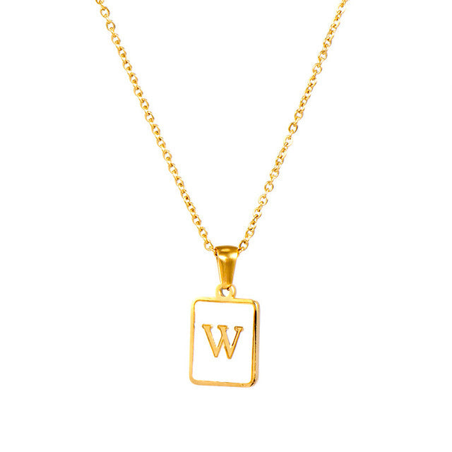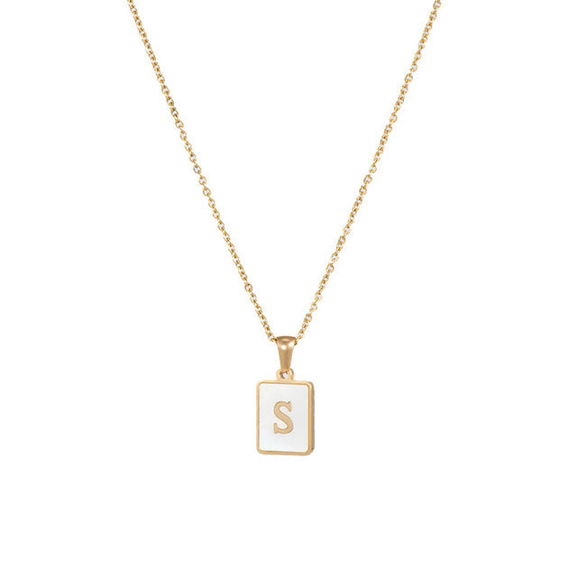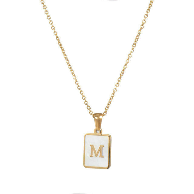 Unisex 18k Gold Plated Stainless Steel Letter Pendant Necklace with White Shell Accents