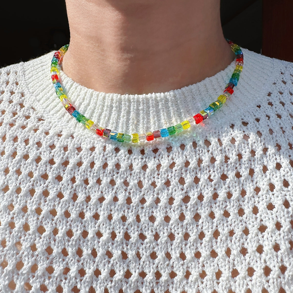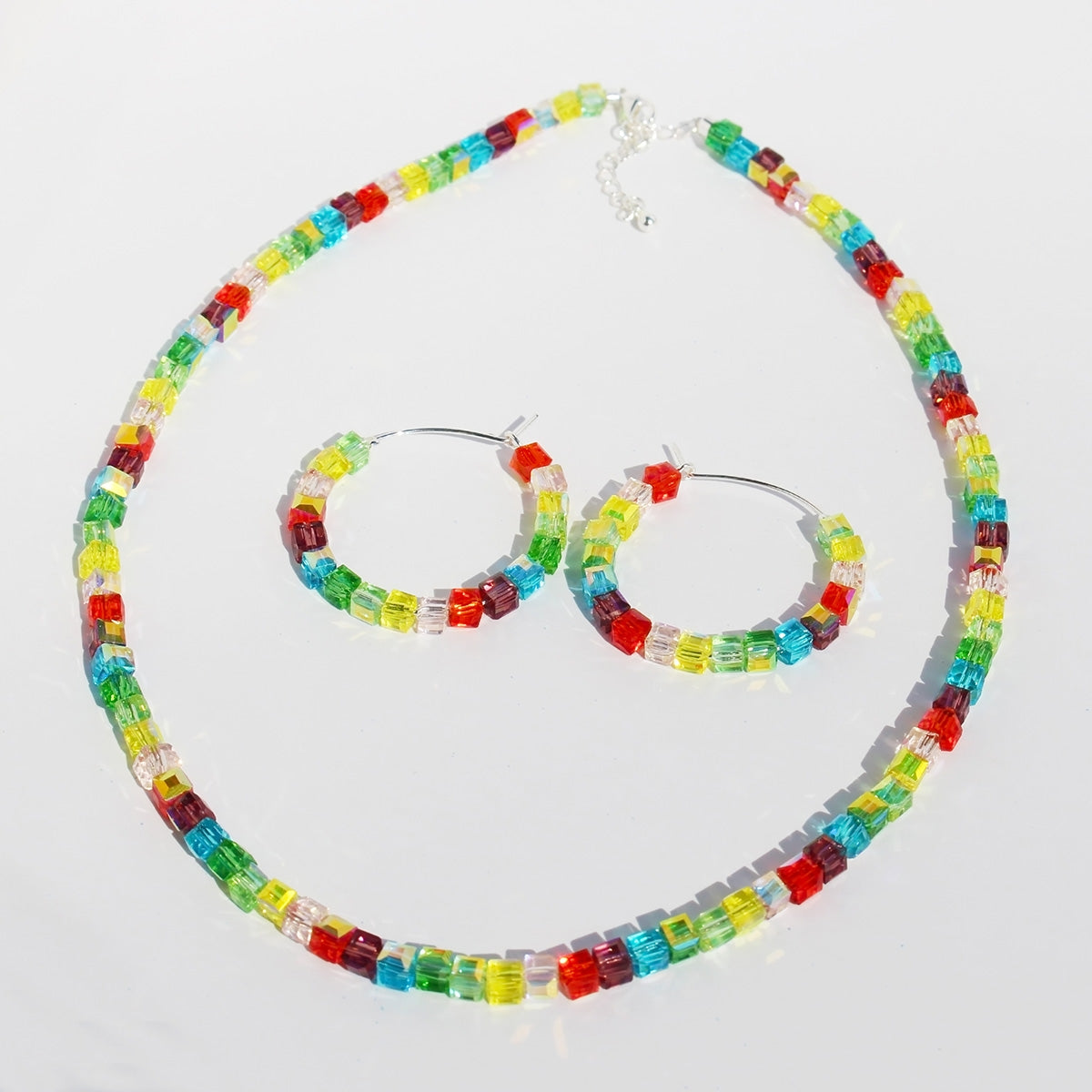Vacation Beach Geometric Crystal Beaded 24K Gold Plated Women's Earrings and Rainbow Necklace Set