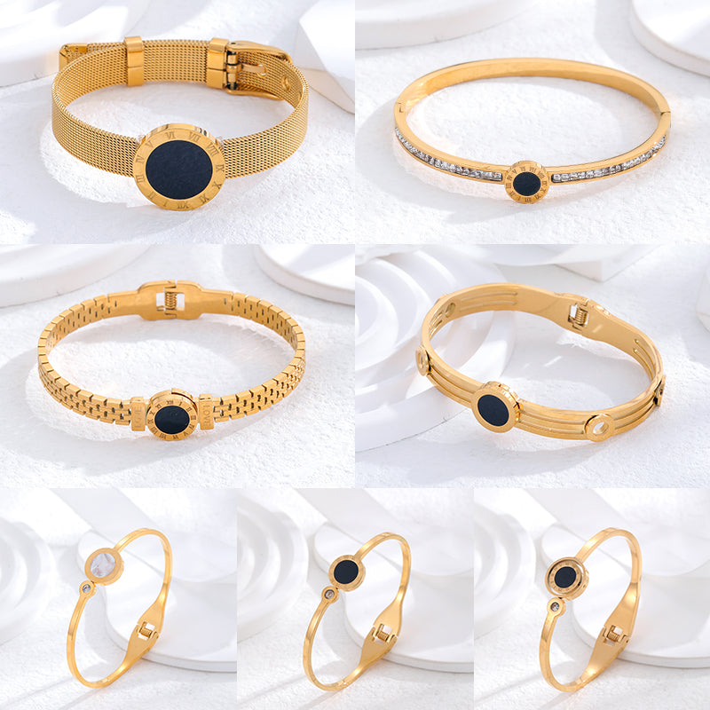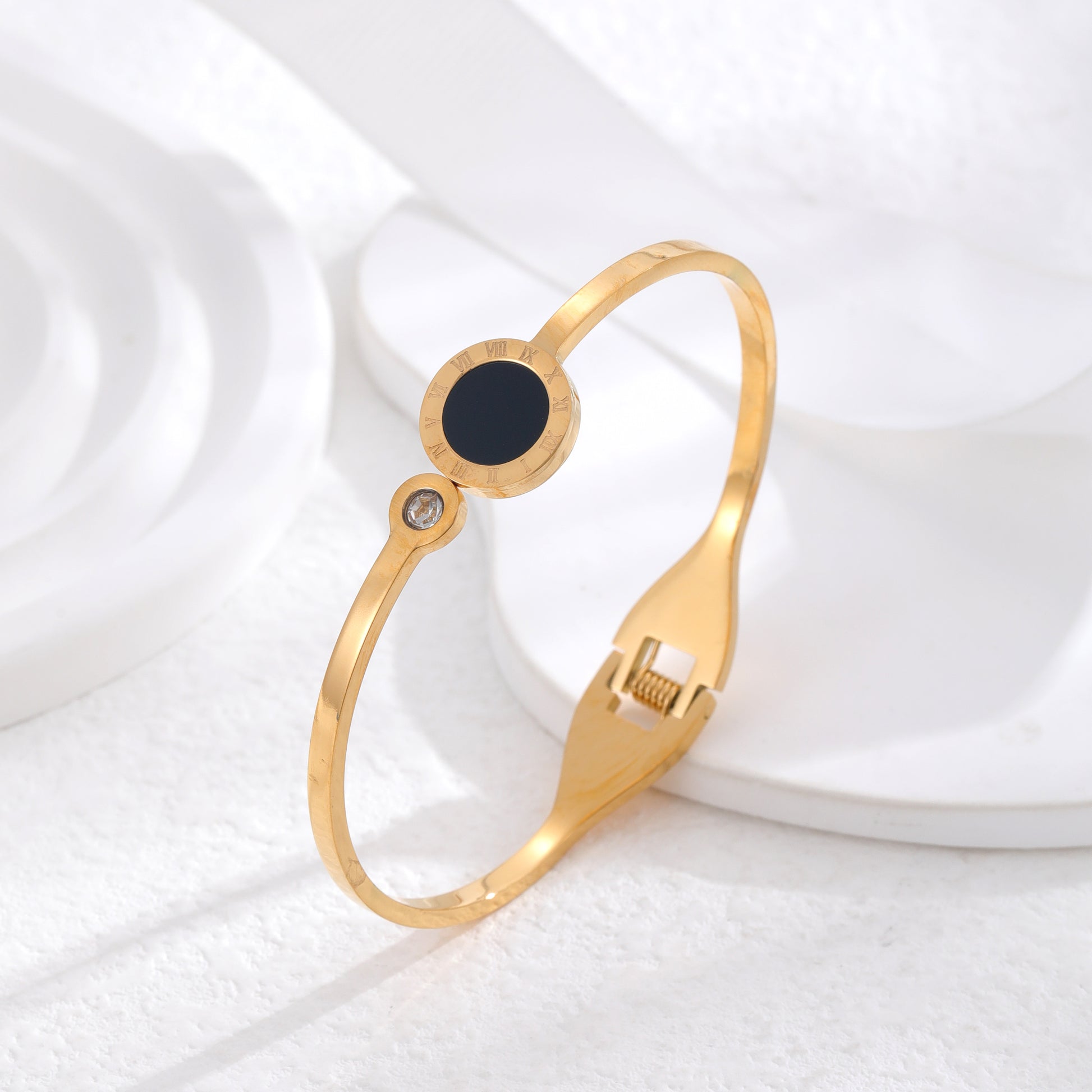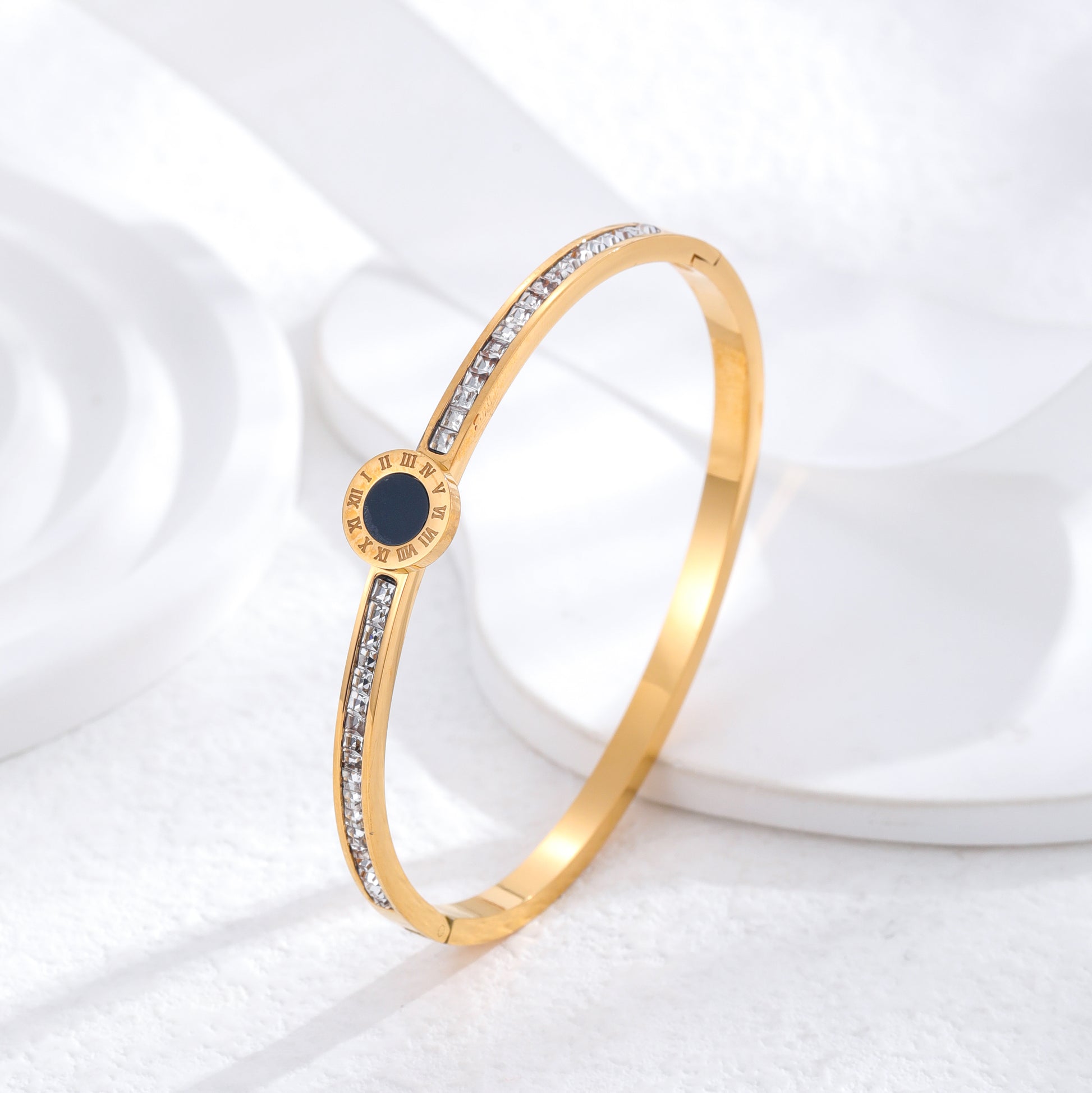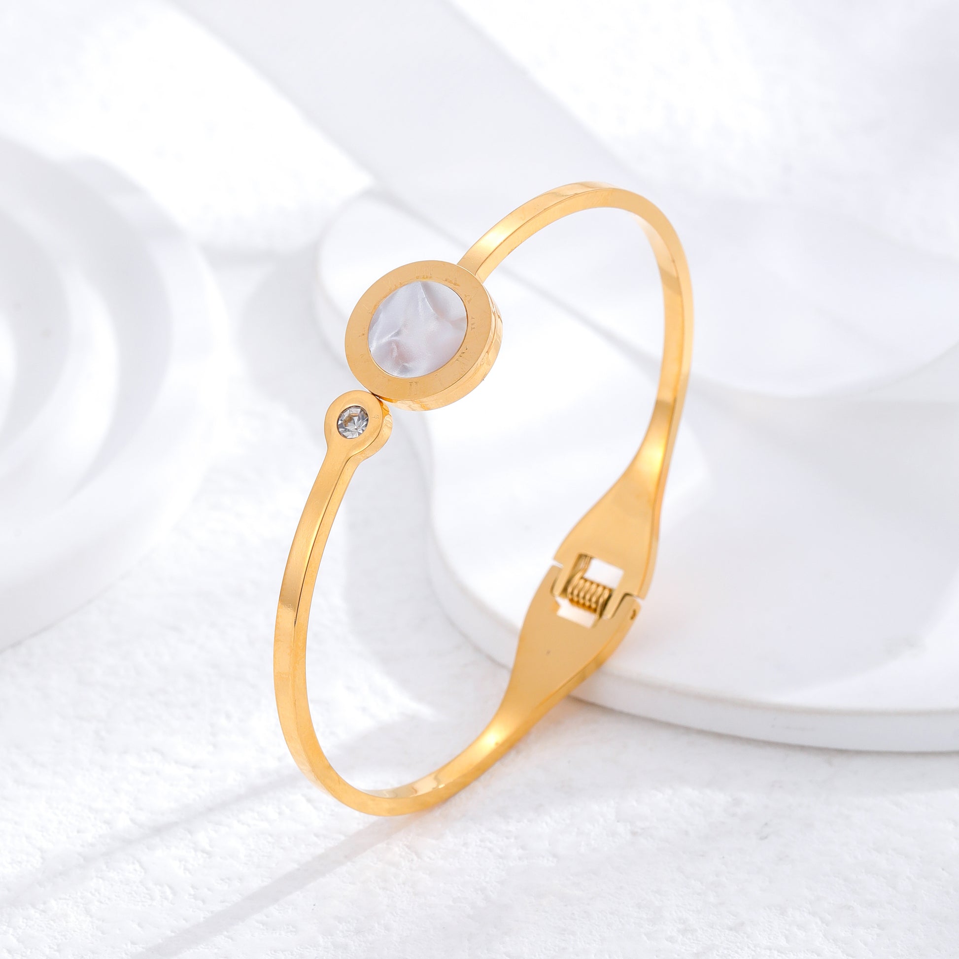 Classic Roman Numeral Gold Plated Titanium Steel Bangle with Rhinestones and White Shell Accent