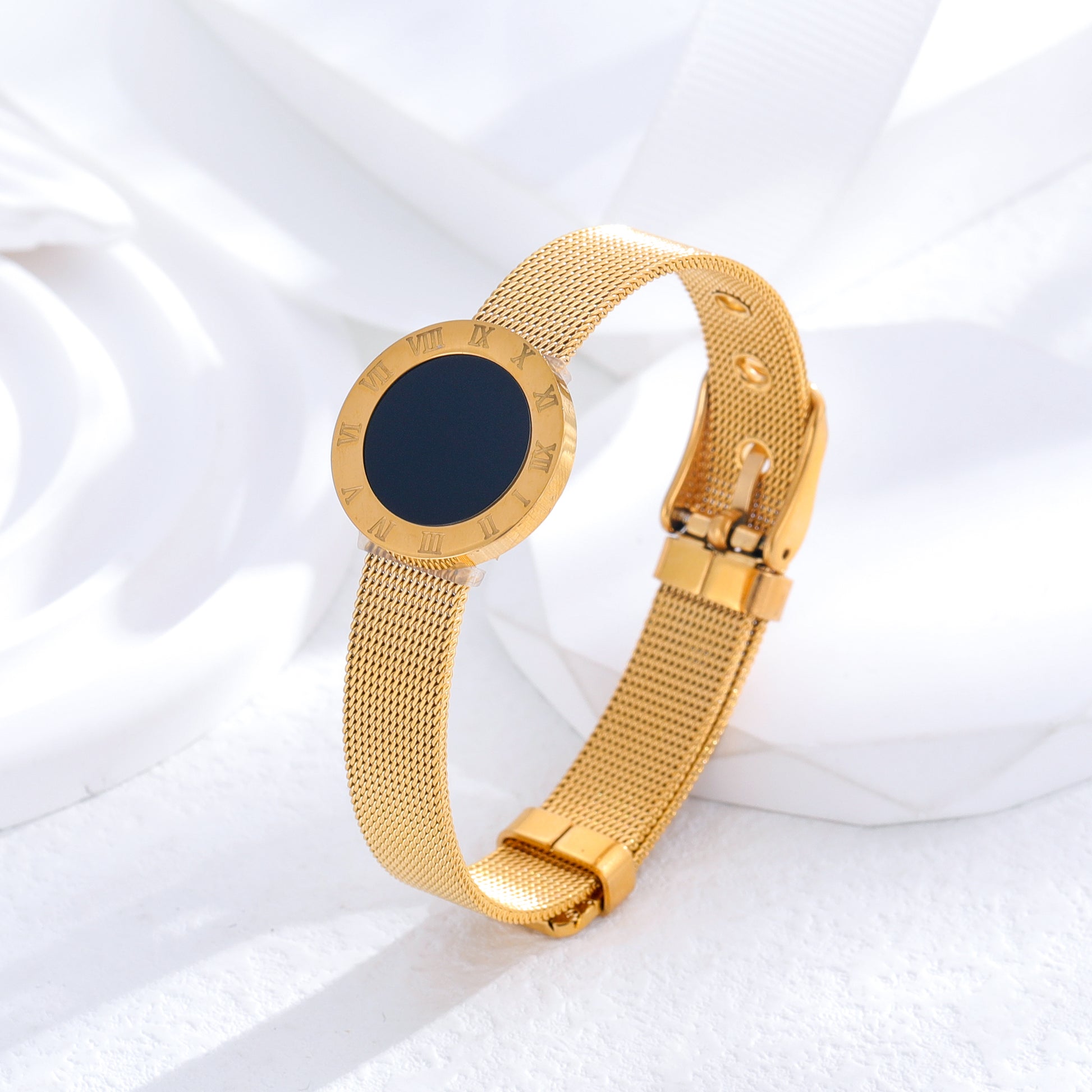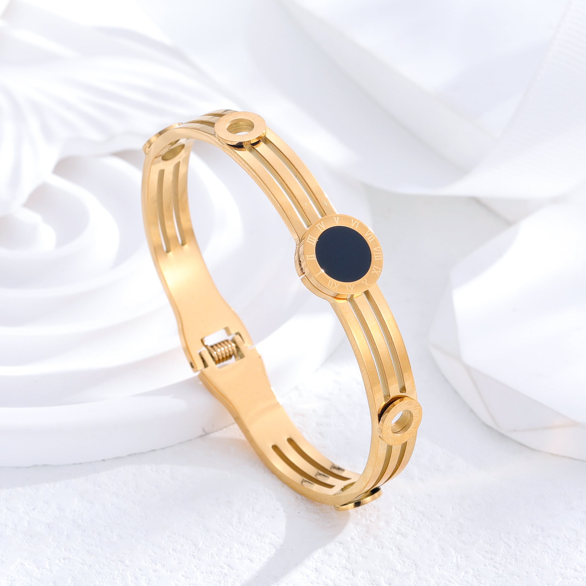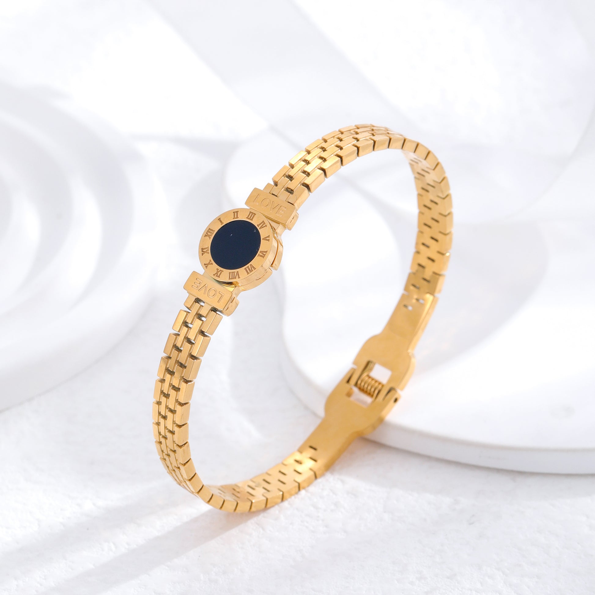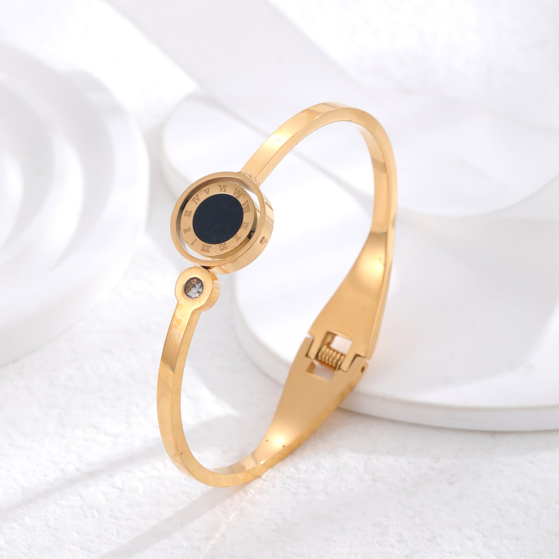 Classic Roman Numeral Gold Plated Titanium Steel Bangle with Rhinestones and White Shell Accent