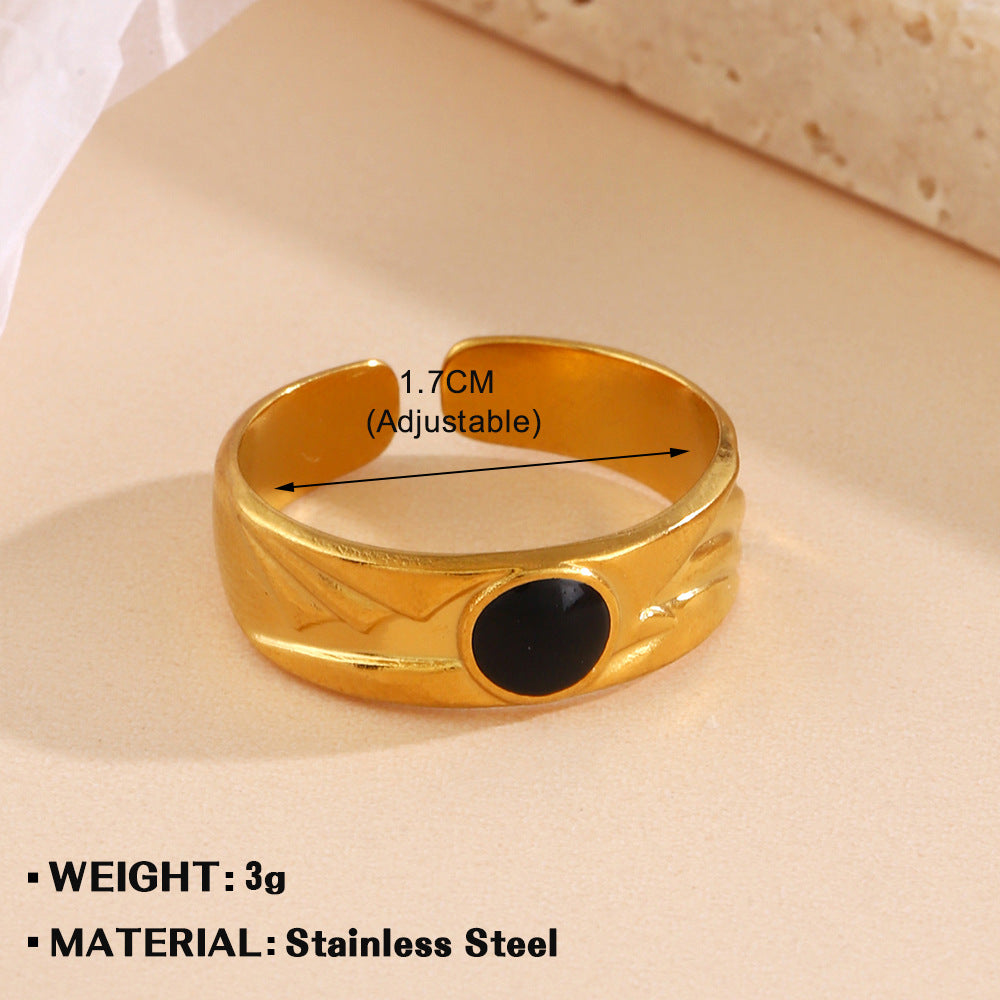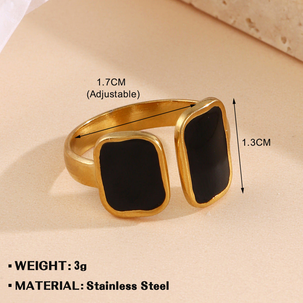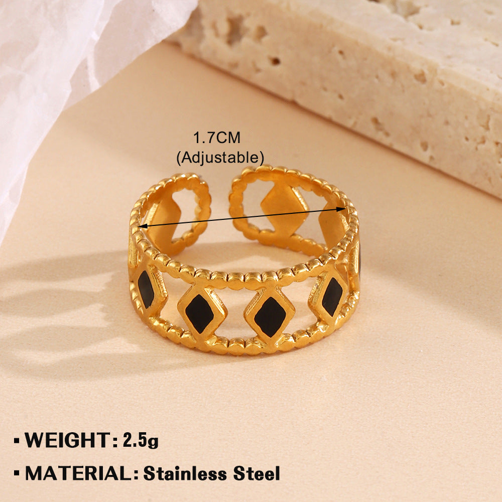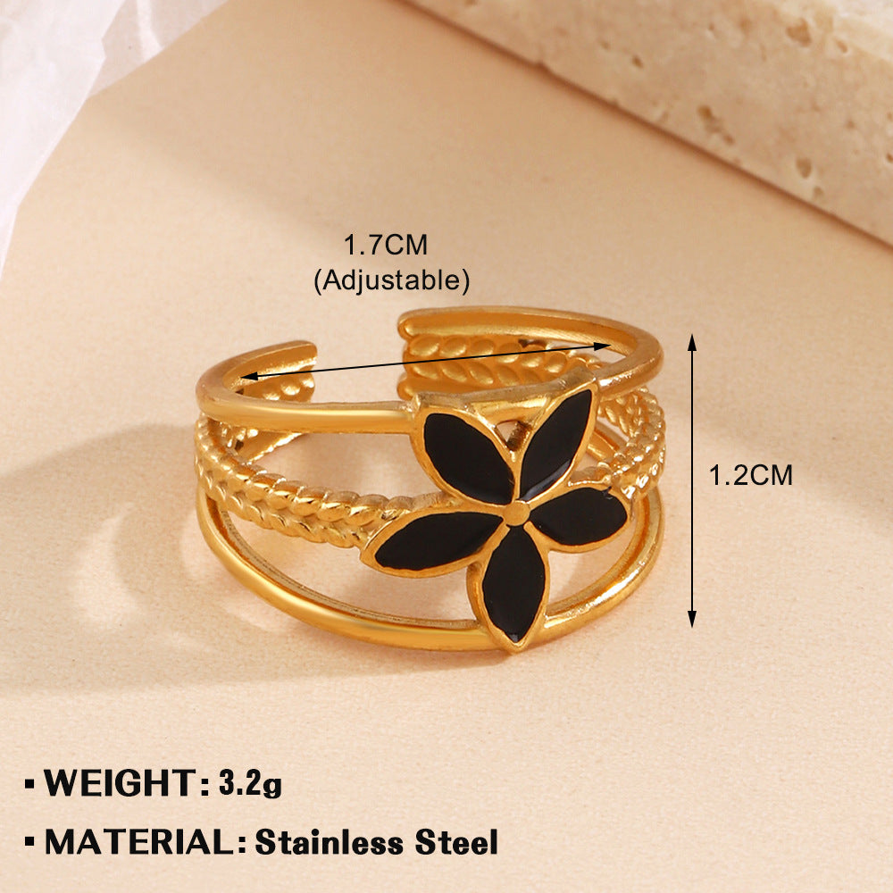 Geometric Cross Floral Black Enamel 18K Gold Plated Open Stainless Steel Ring