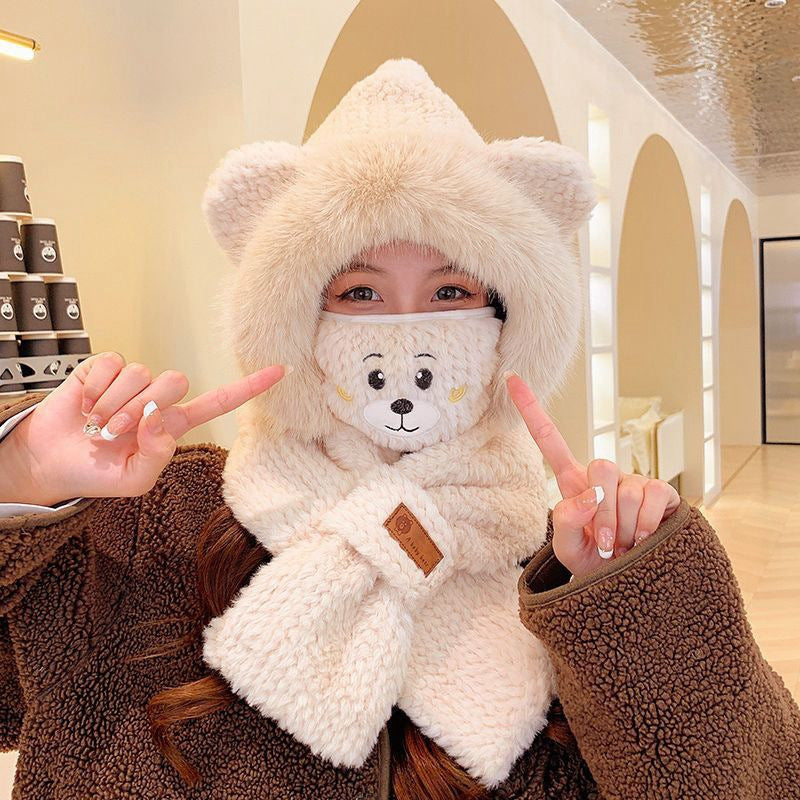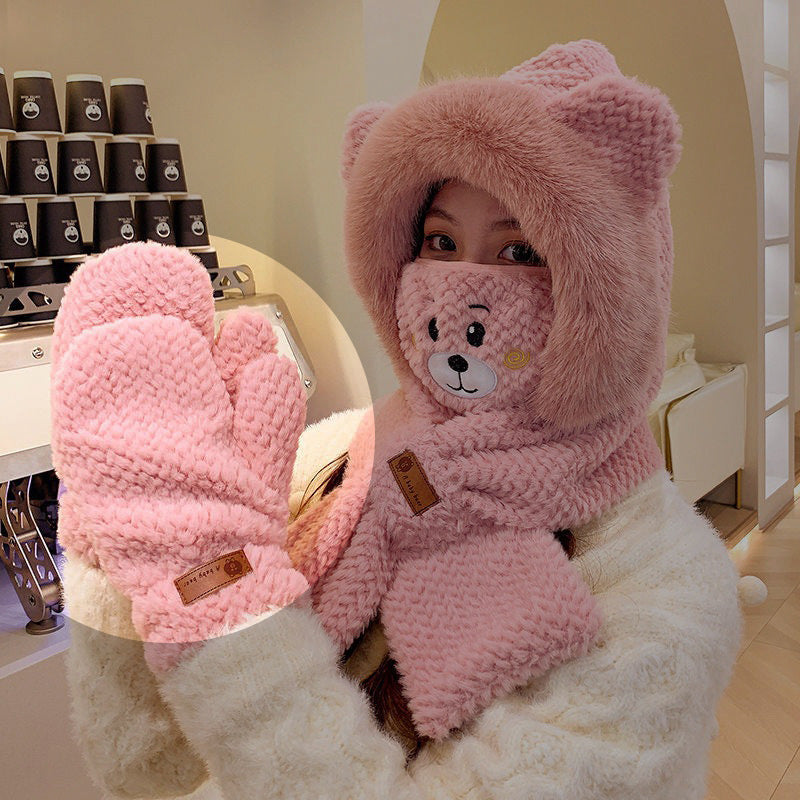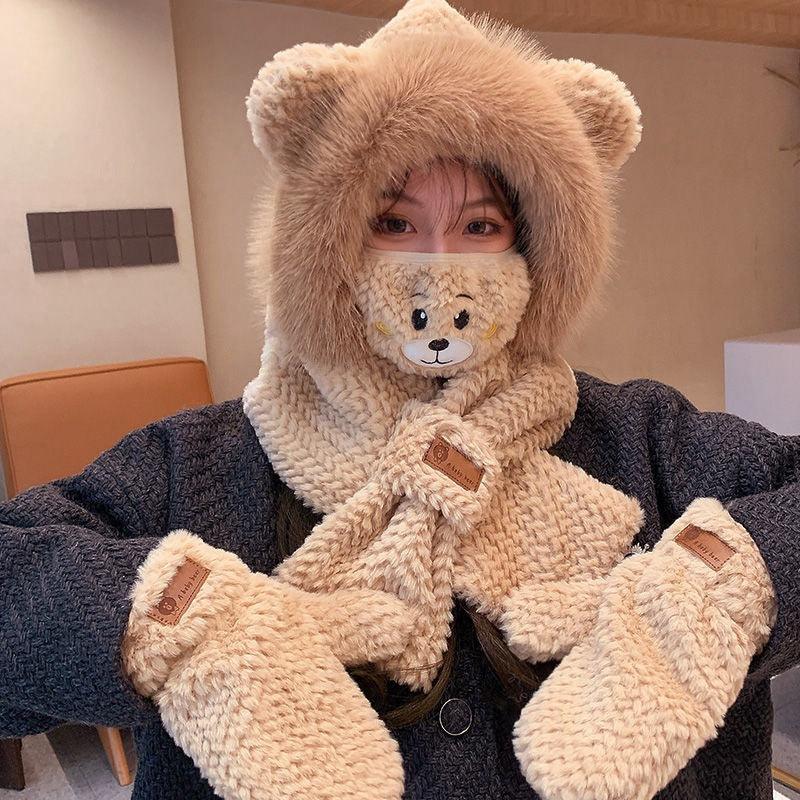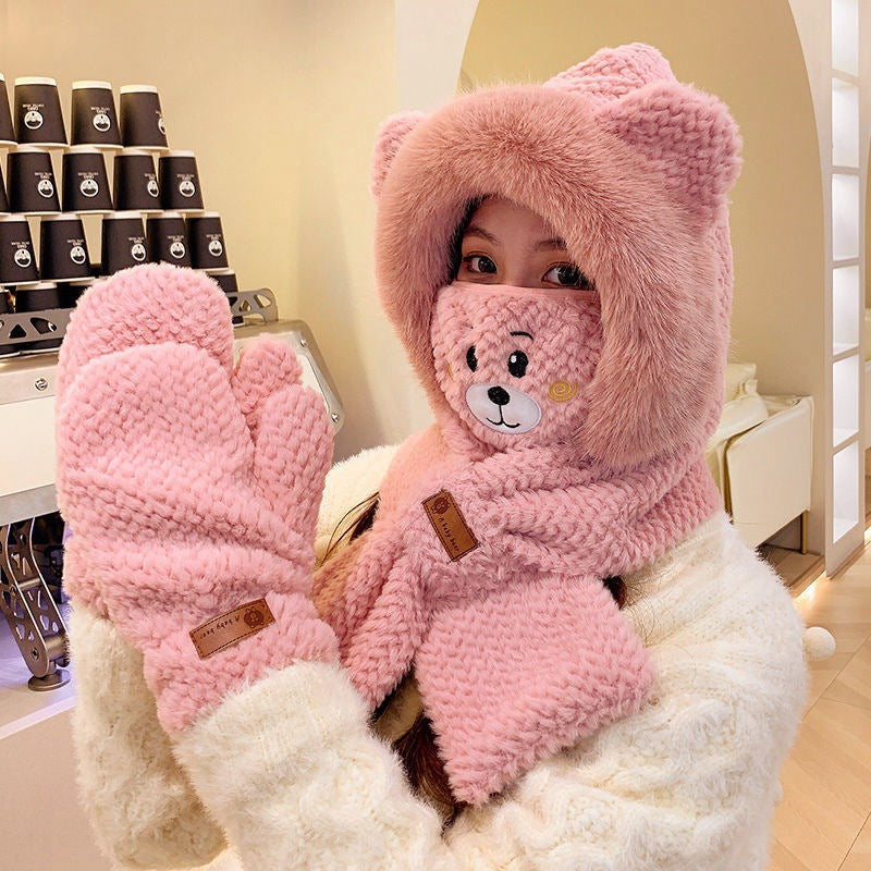 Women's Adorable Solid Color Woolen Scarf, Hat, and Gloves Set with Bear Design