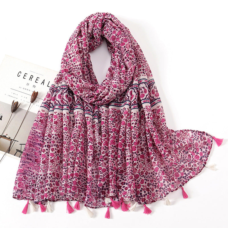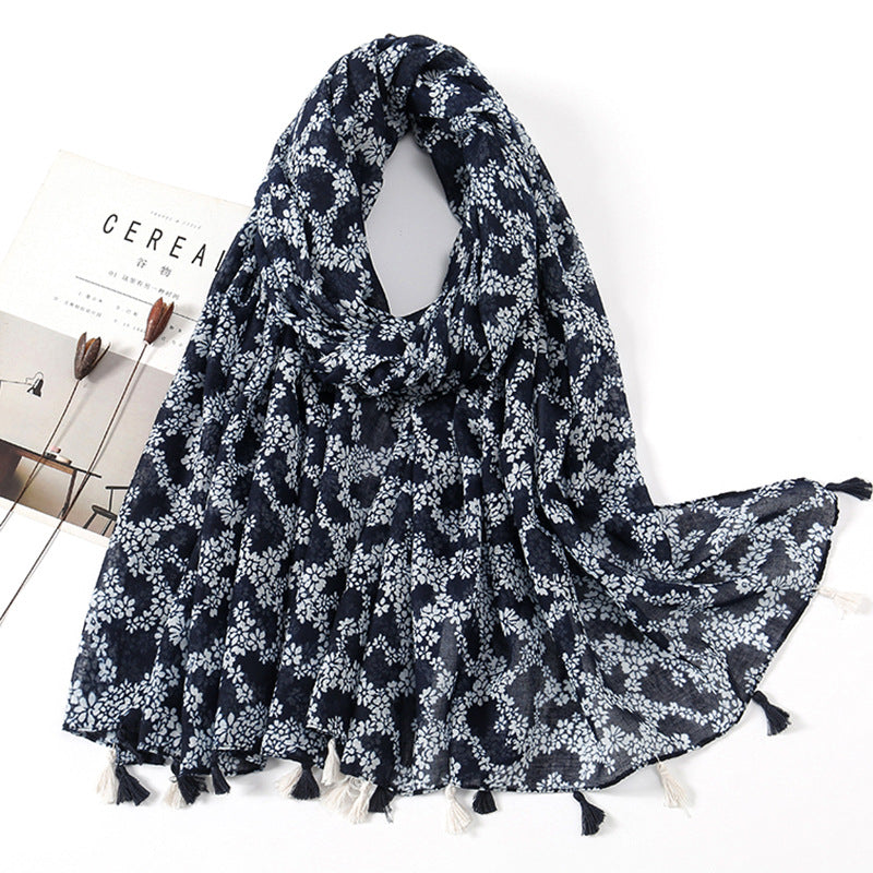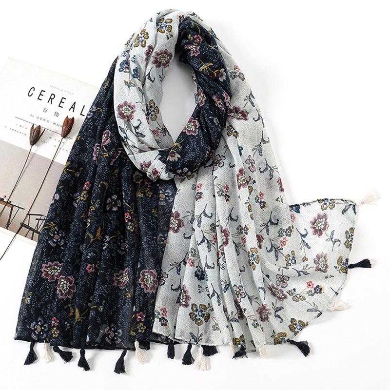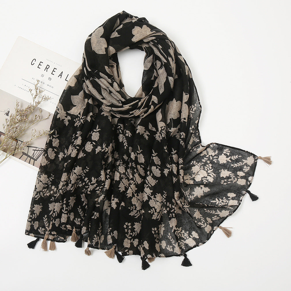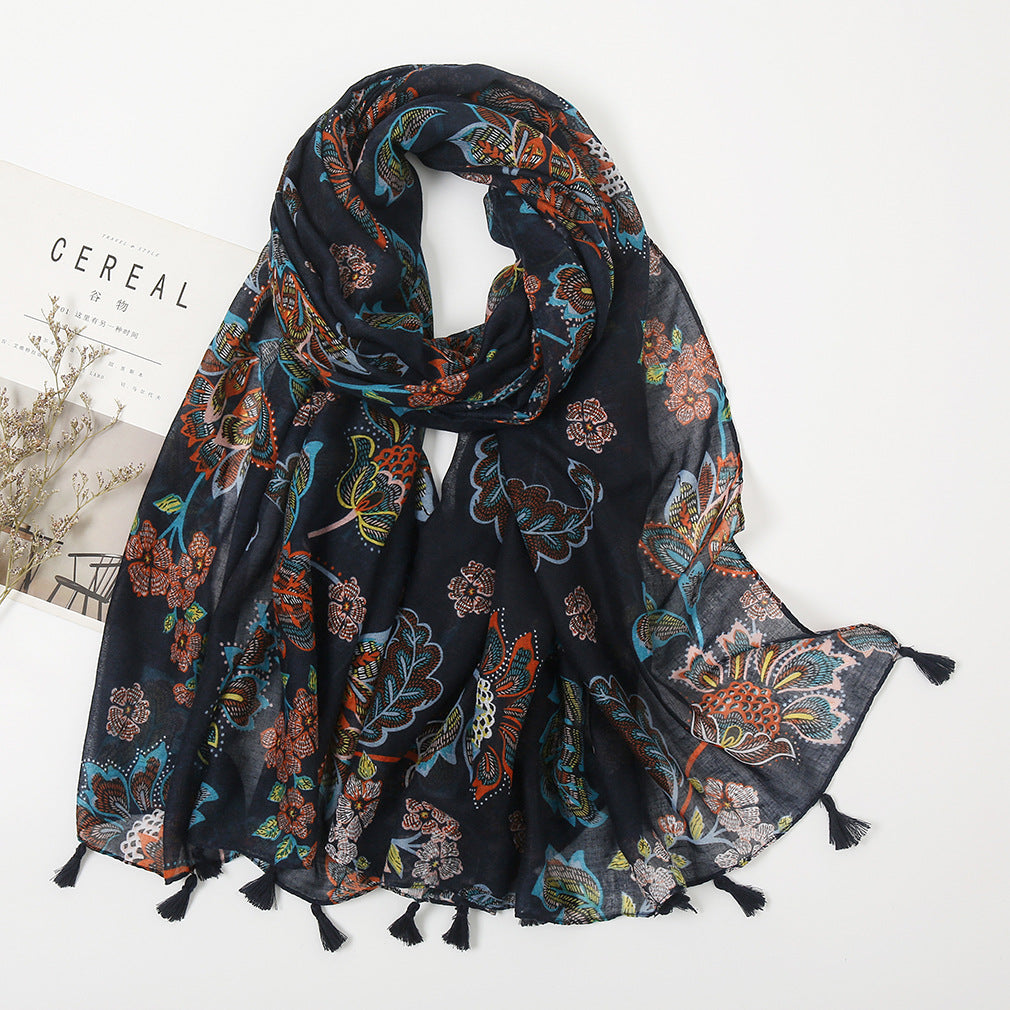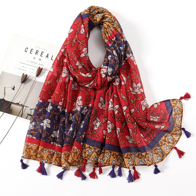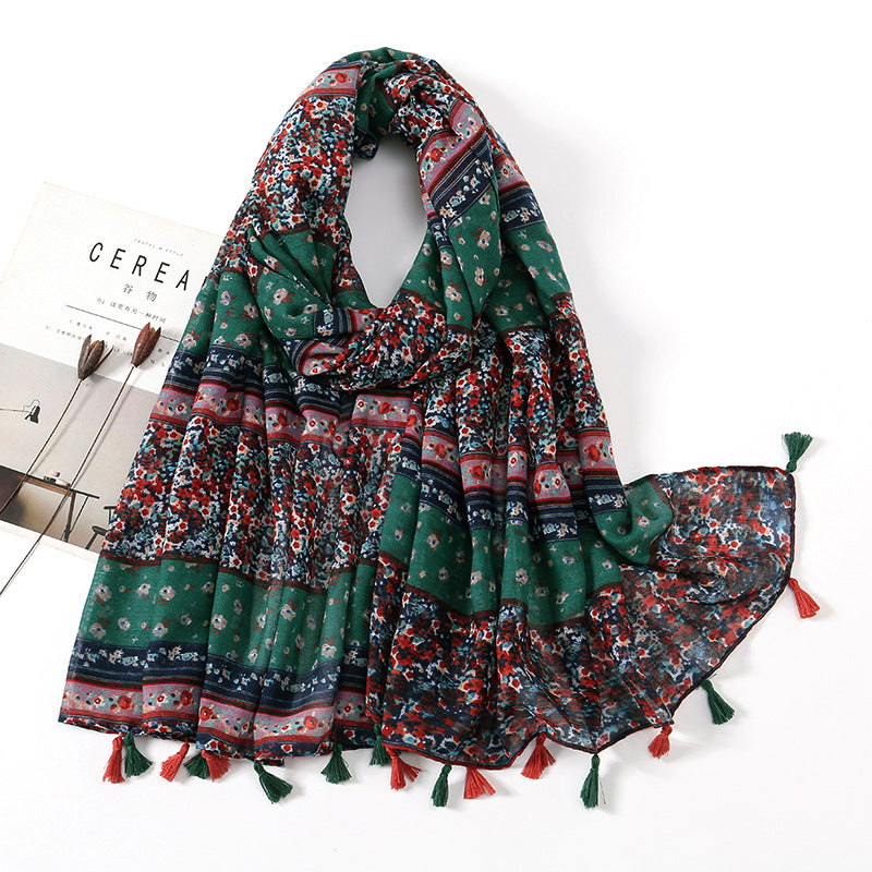 Women's Vintage Bohemian Floral Cotton Linen Print Scarf with Tassels