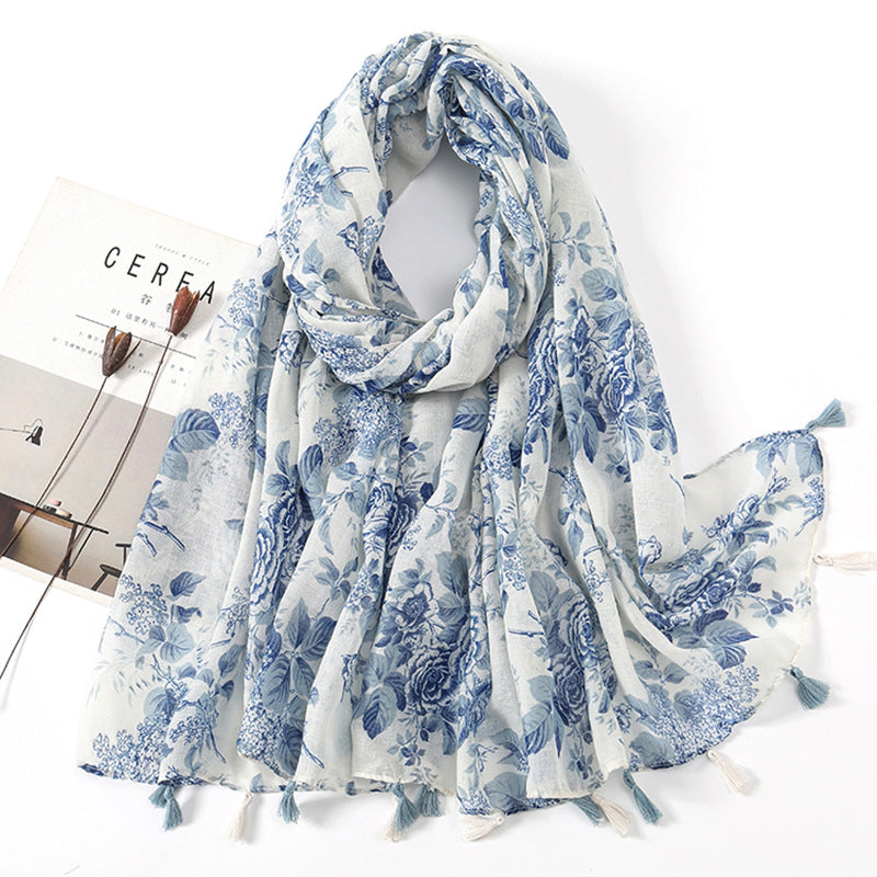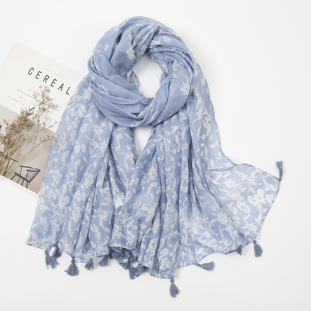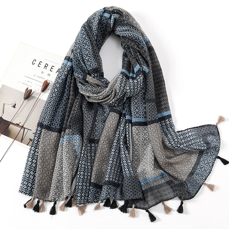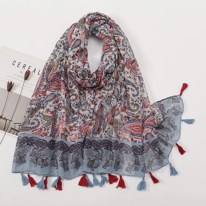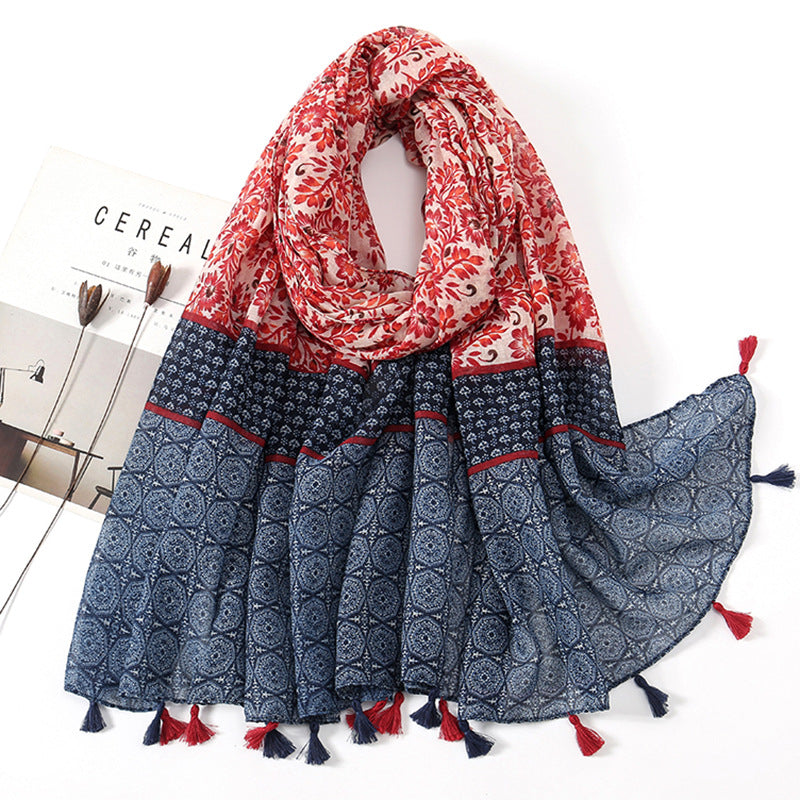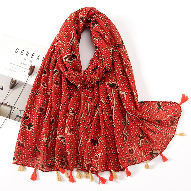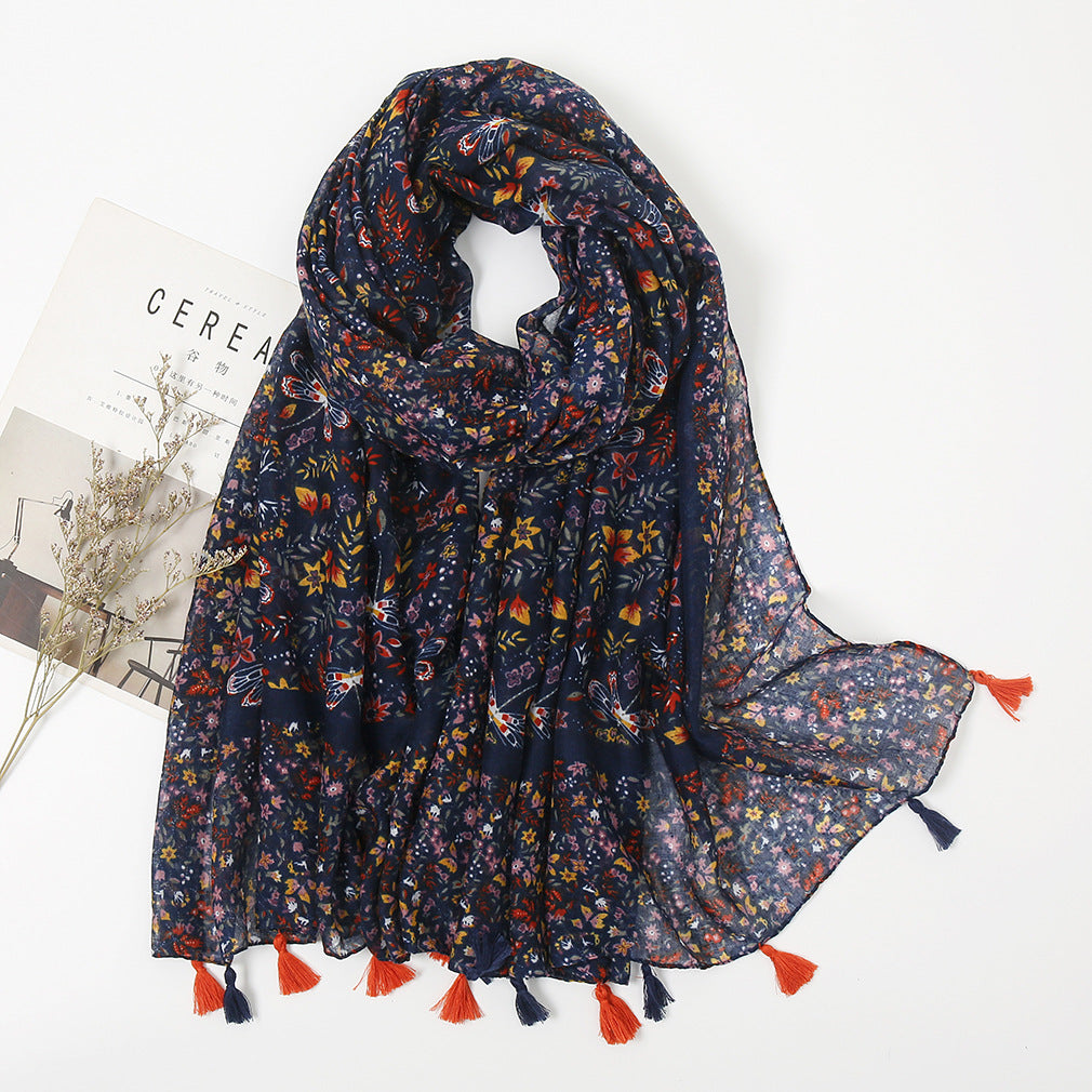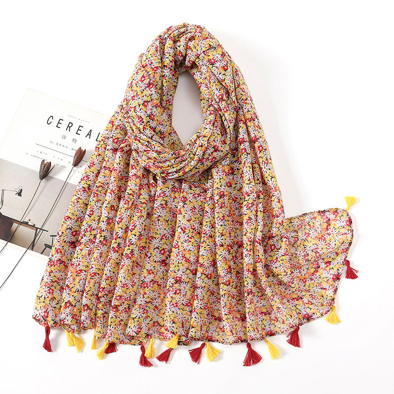 Women's Vintage Bohemian Floral Cotton Linen Print Scarf with Tassels