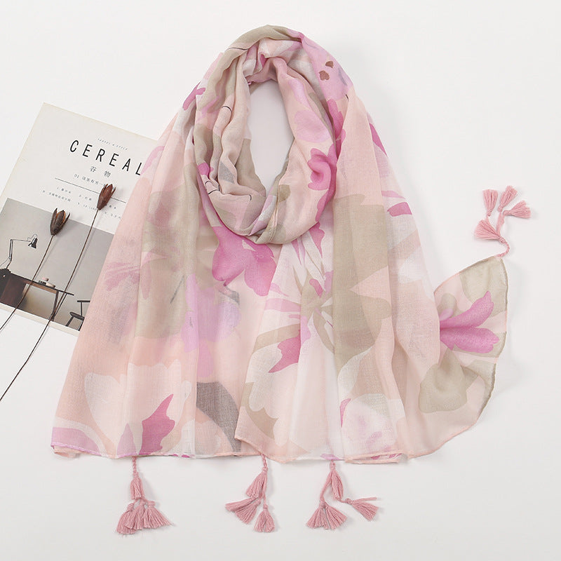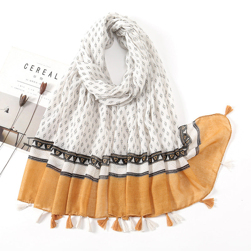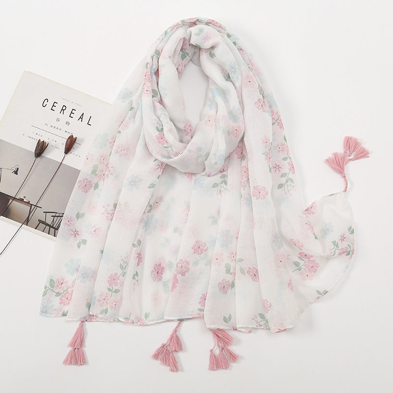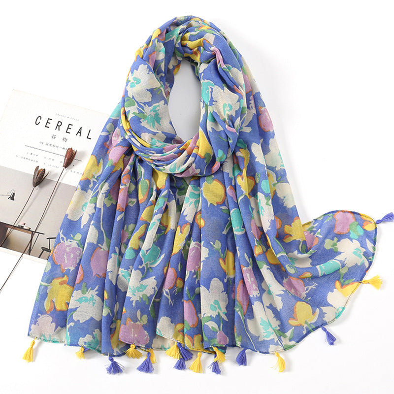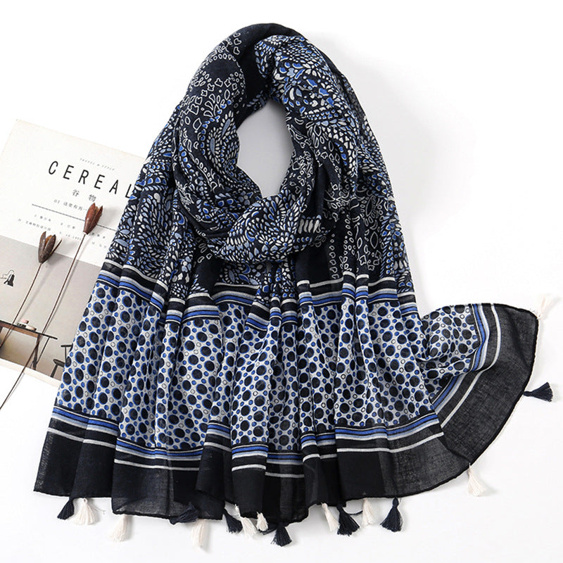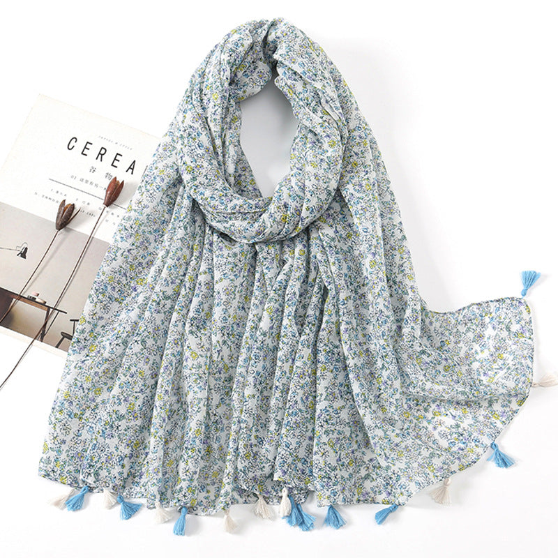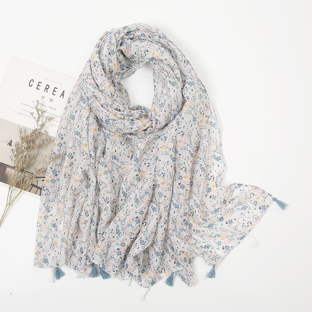 Women's Vintage Bohemian Floral Cotton Linen Print Scarf with Tassels