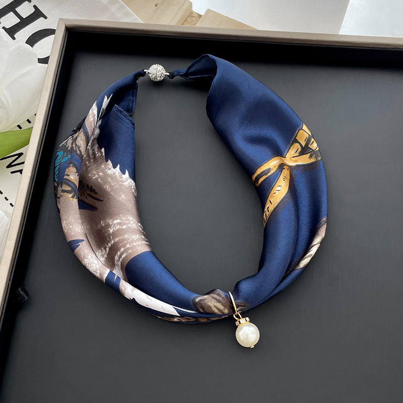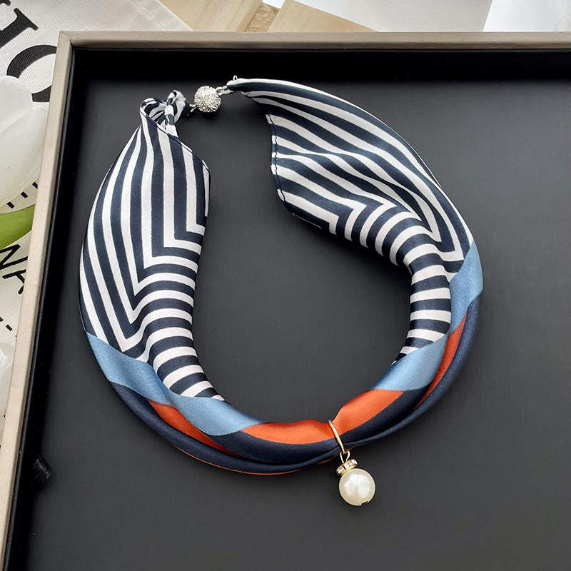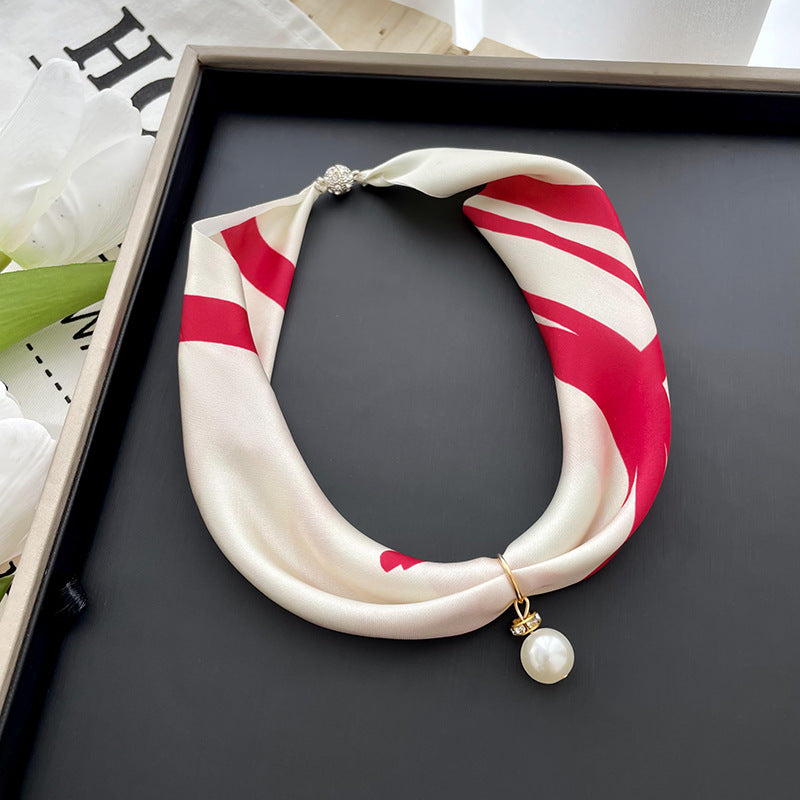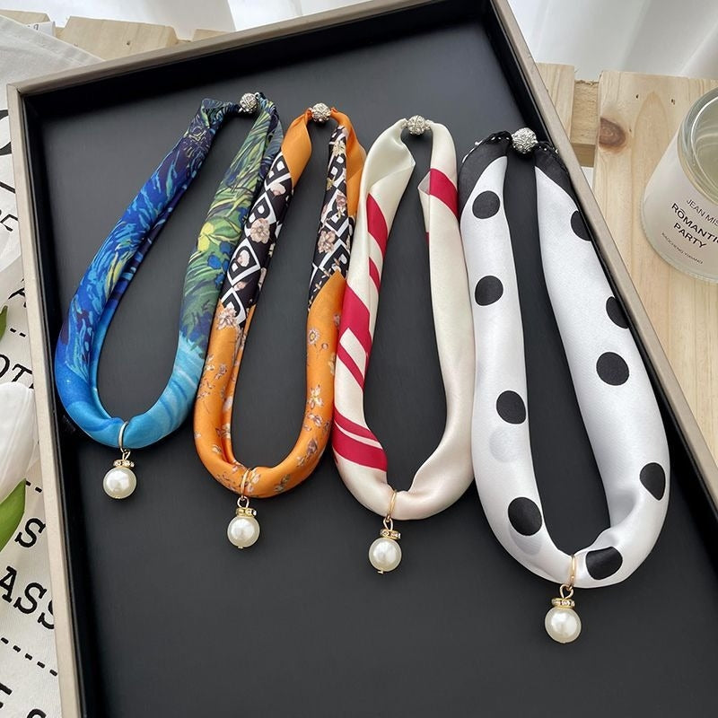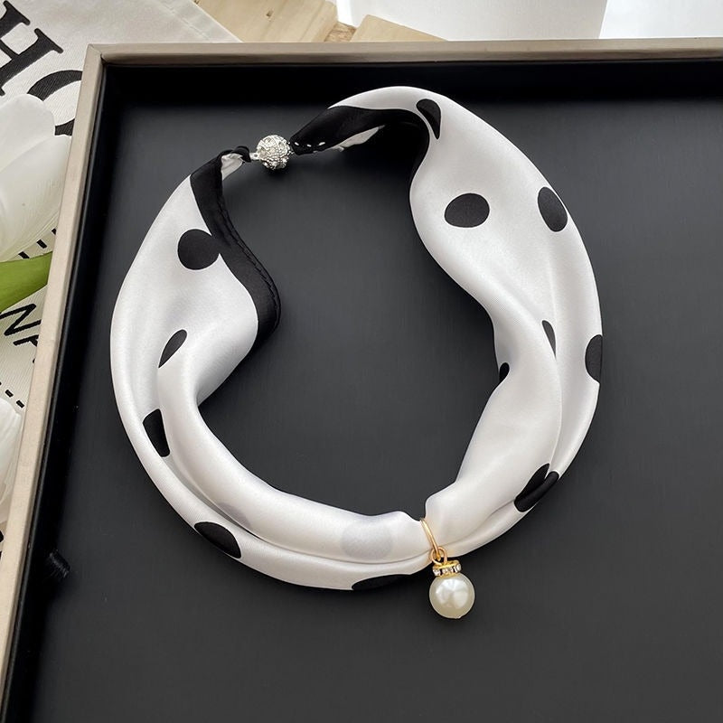 Women's Polka Dots Silk Scarf Necklace with Magnetic Clasp and Pearl Accent