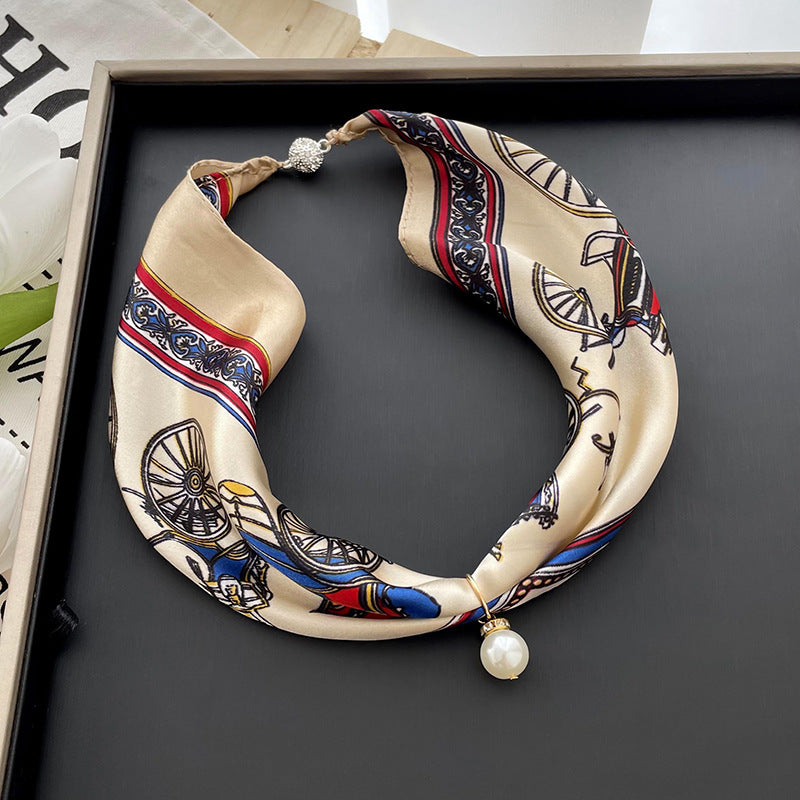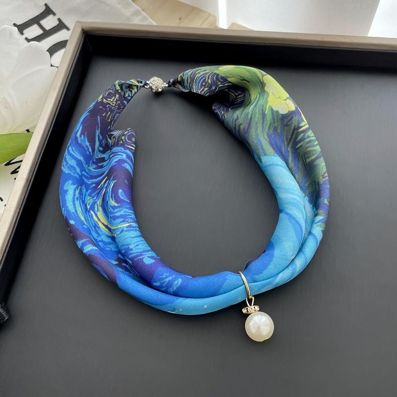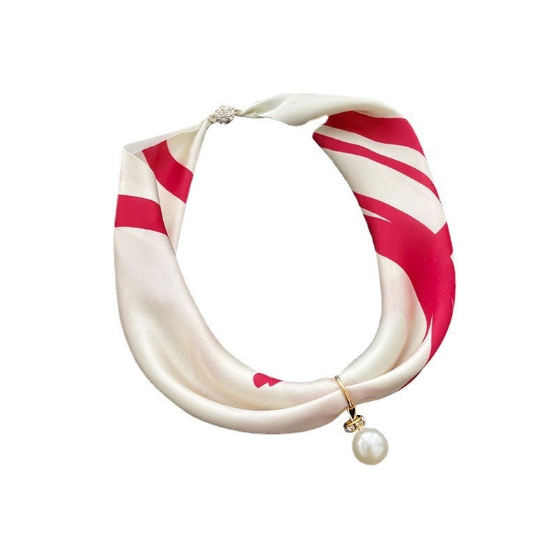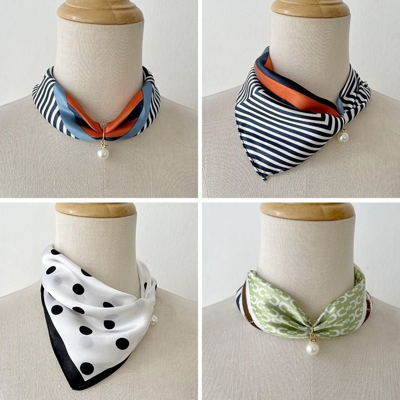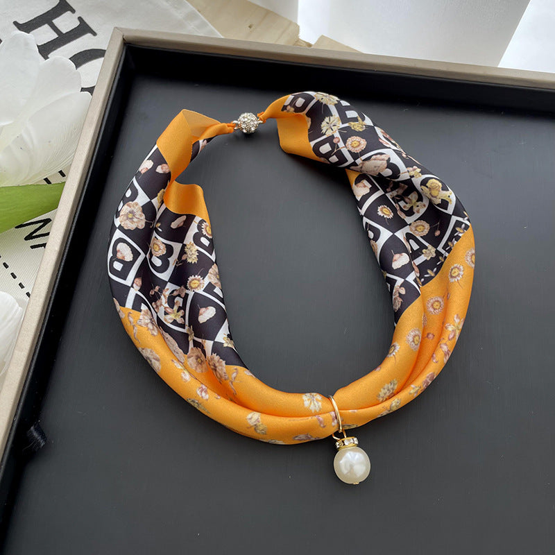Women's Polka Dots Silk Scarf Necklace with Magnetic Clasp and Pearl Accent