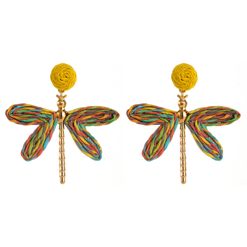 Dragonfly Raffia Gold Plated Drop Earrings - Bohemian Vacation Style