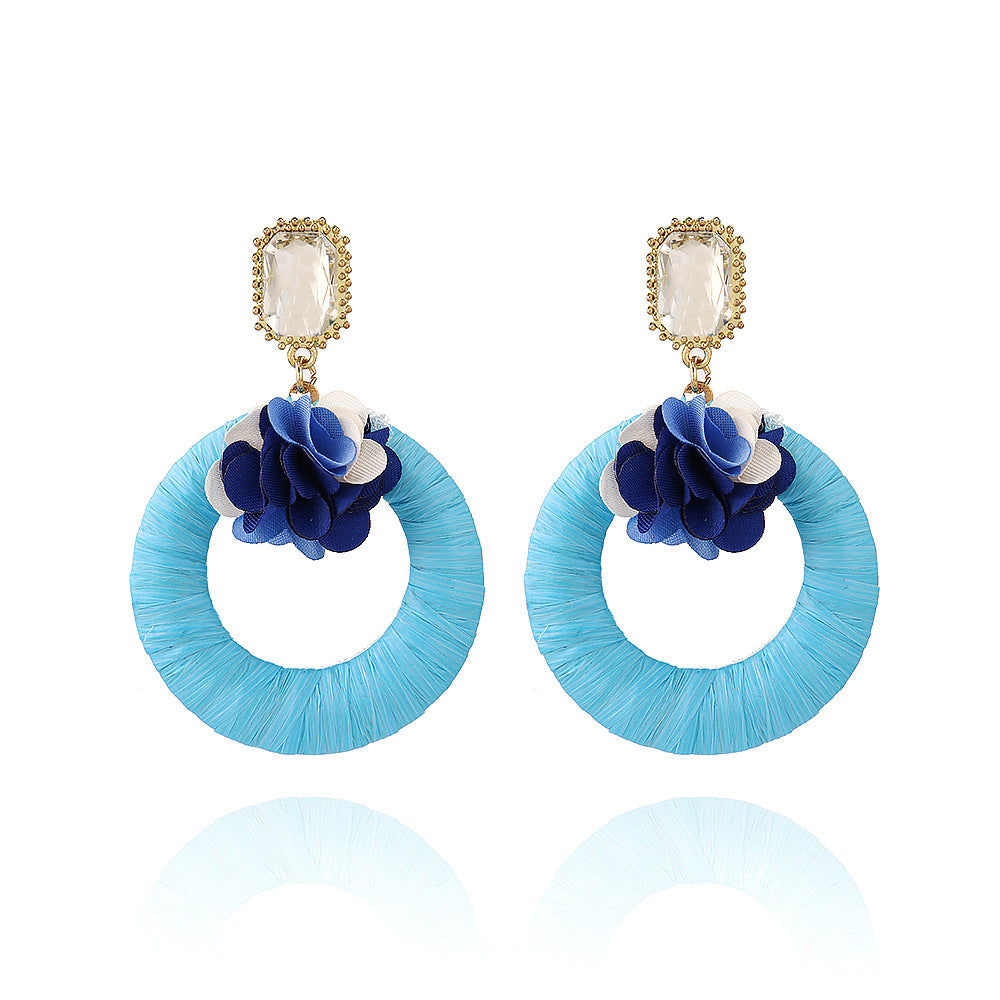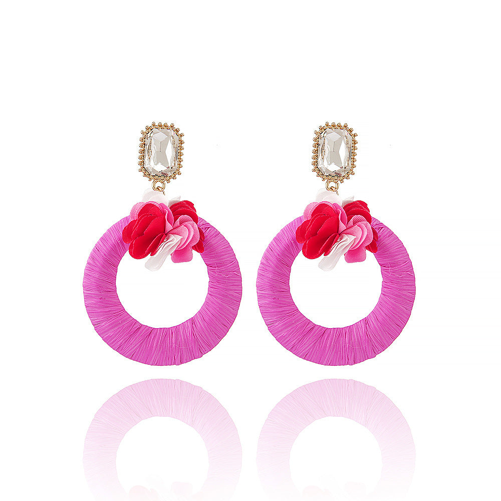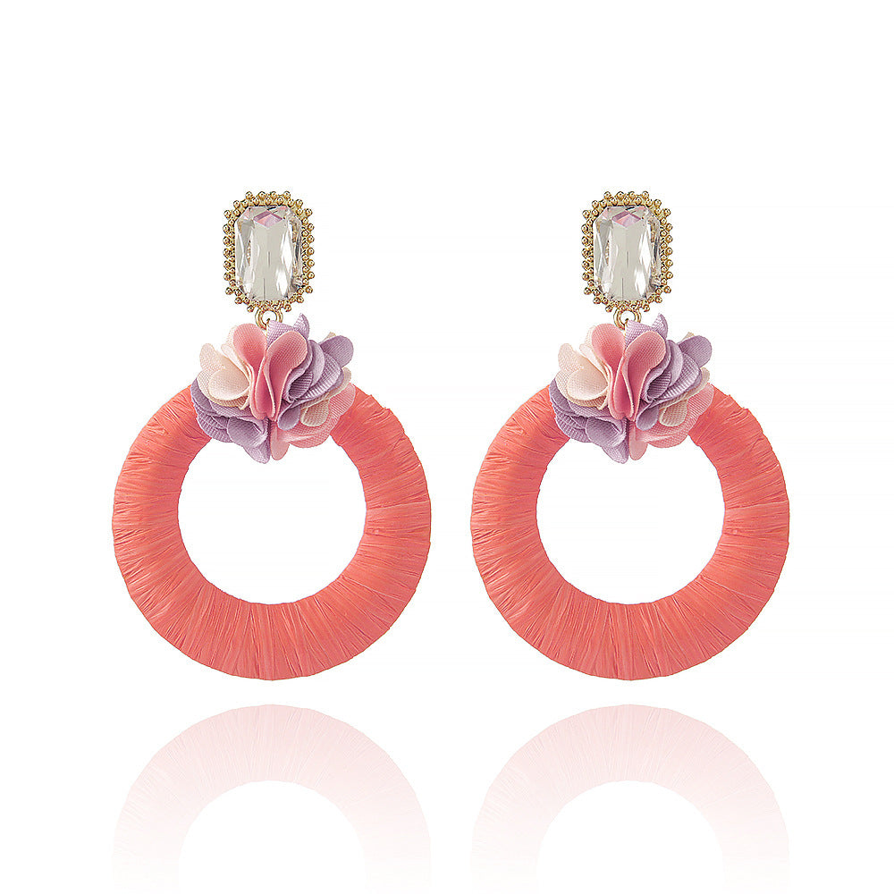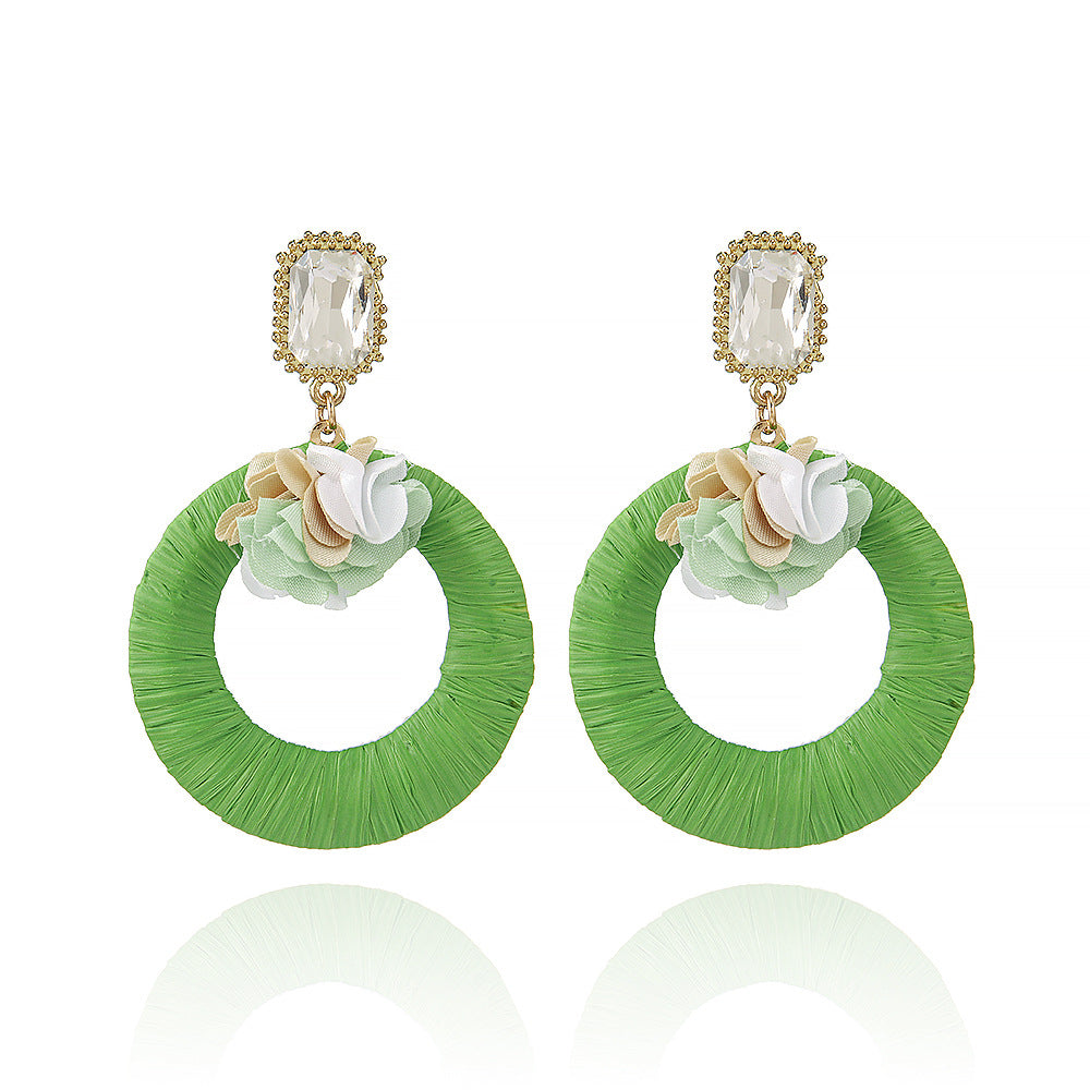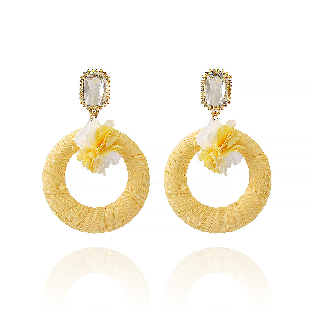 1 Pair Tropical Round Flower Raffia Rhinestone Drop Earrings