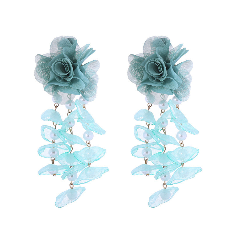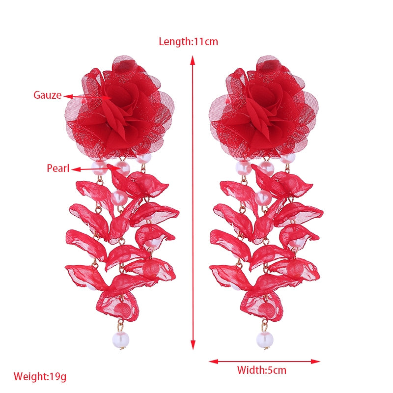 1 Pair Bohemian Flower Imitation Pearl Gauze Tassel Drop Earrings