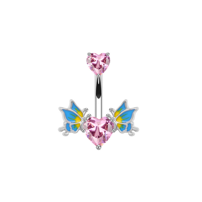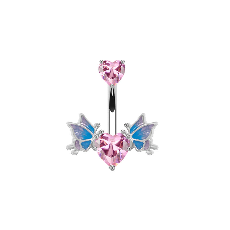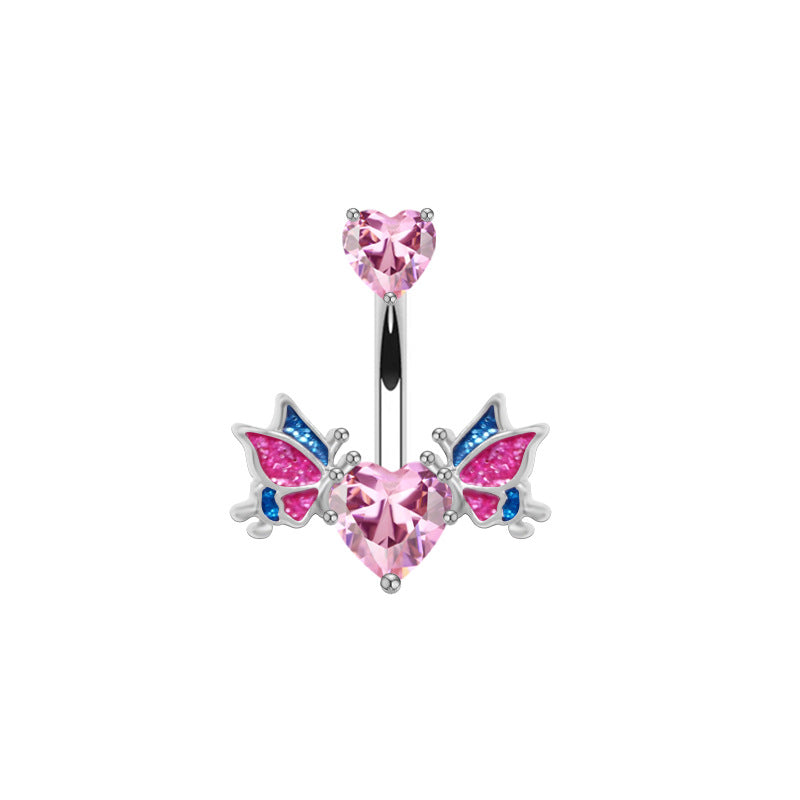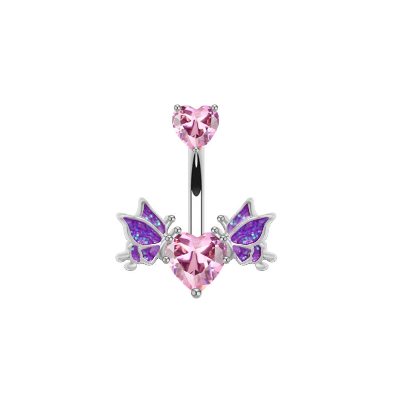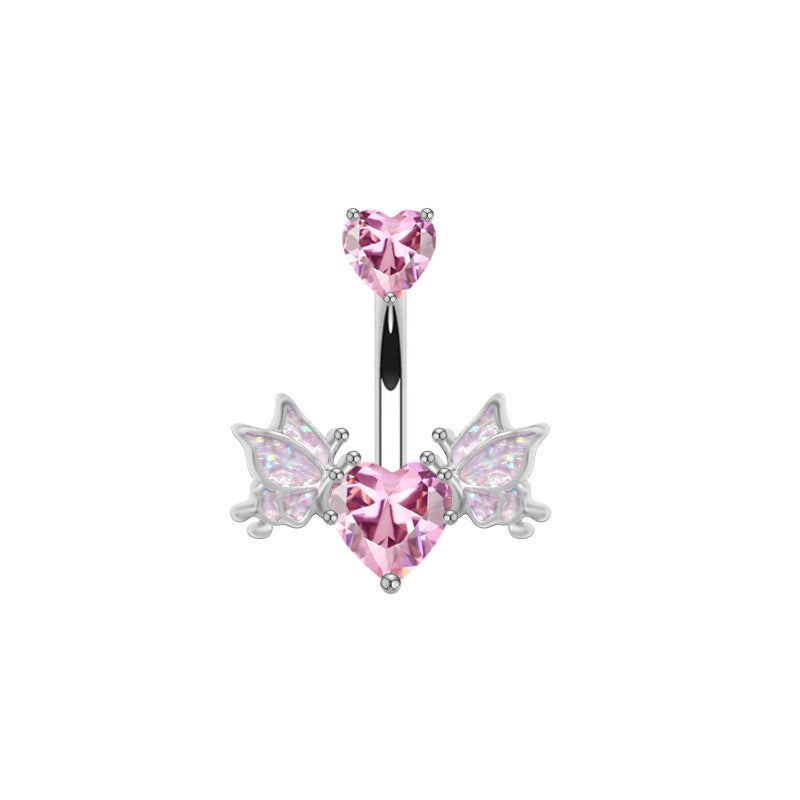 Heart Shape Butterfly Wing Belly Ring - 316 Stainless Steel with Rhinestones, White Gold Plated