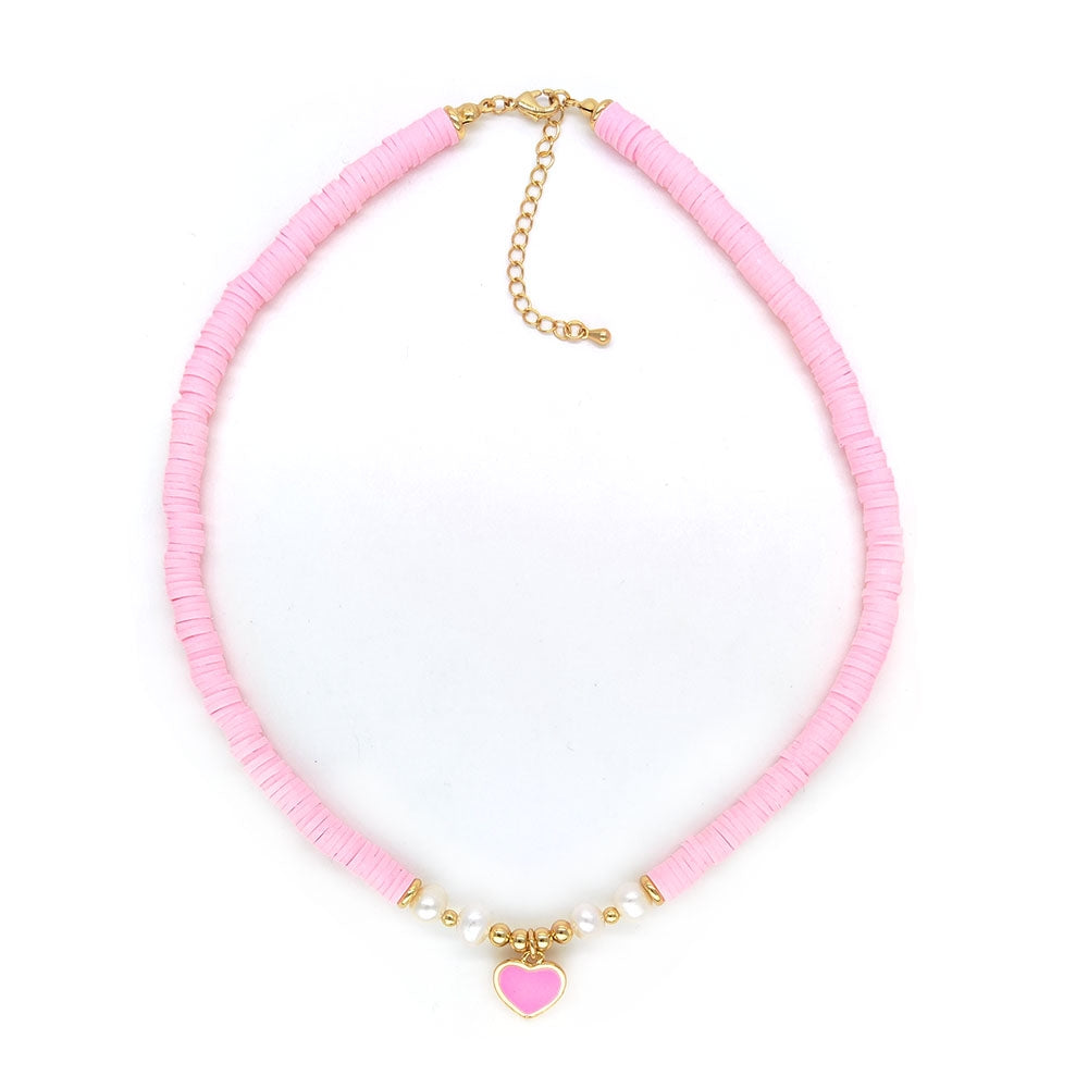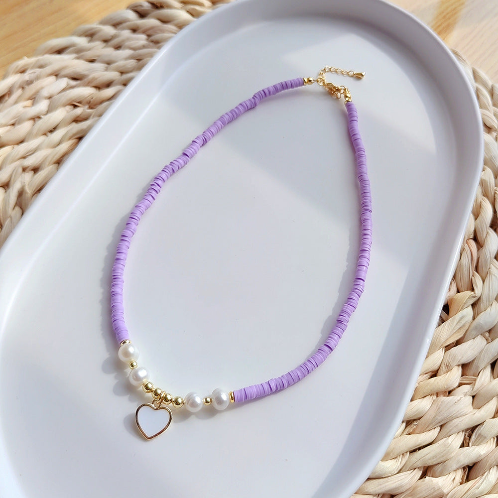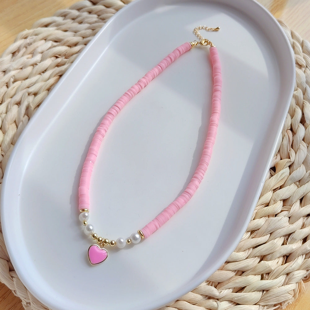 Simple Heart Shape Soft Clay Beaded Necklace with Natural Pearl Pendant