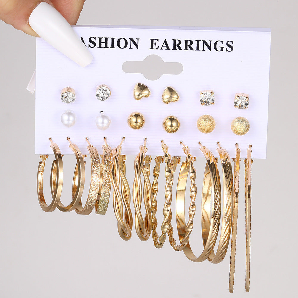 Retro Heart & Round Shape Alloy Earrings Set with Pearl and Rhinestone Embellishments - 12 Pairs
