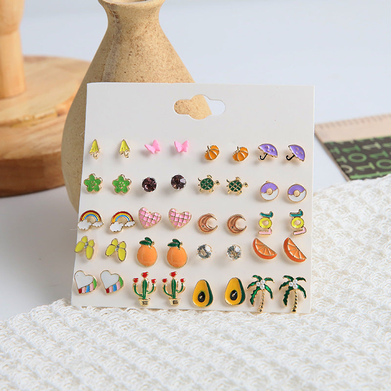 Set of Colorful Enamel Butterfly and Cactus Fruit Stud Earrings - 20 Pairs Cartoon Rainbow Avocado Design