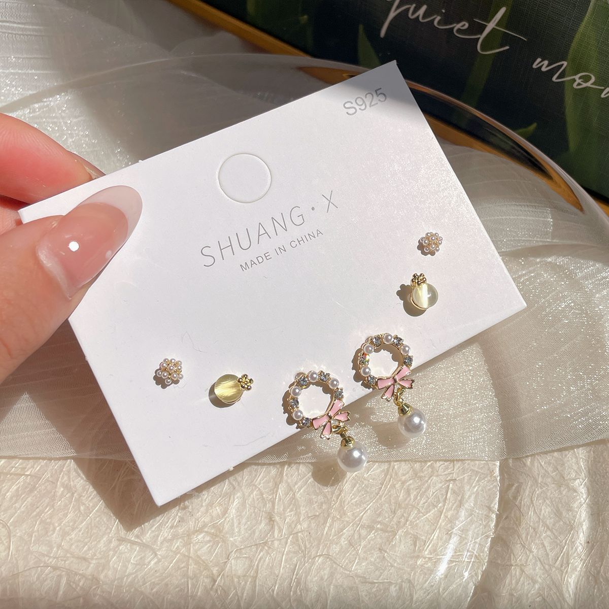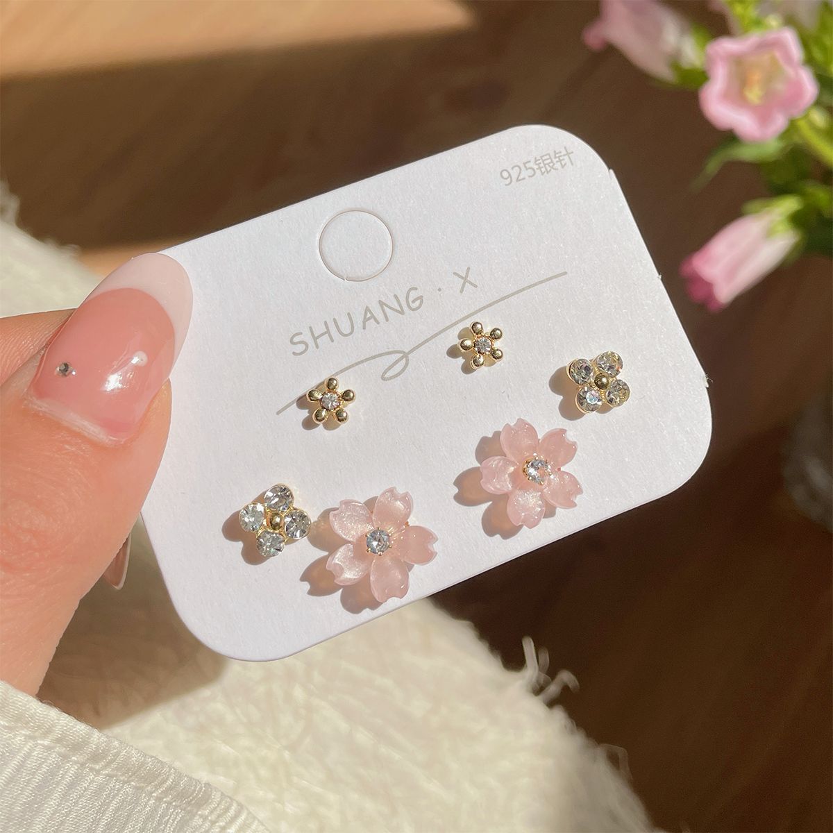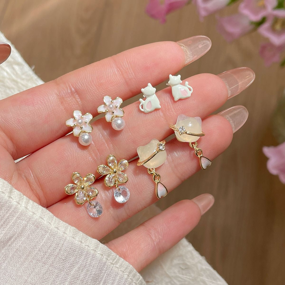 Sweet Floral Enamel Alloy Stud Earrings Set with Zirconia Cat Design