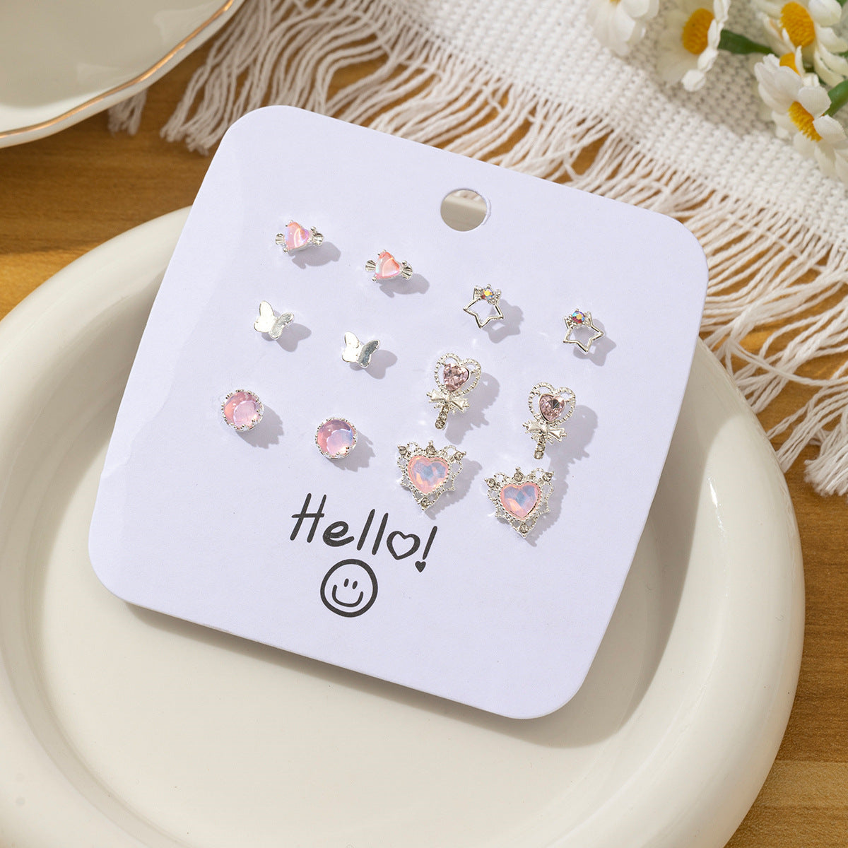 Pink heart stud earrings set of six