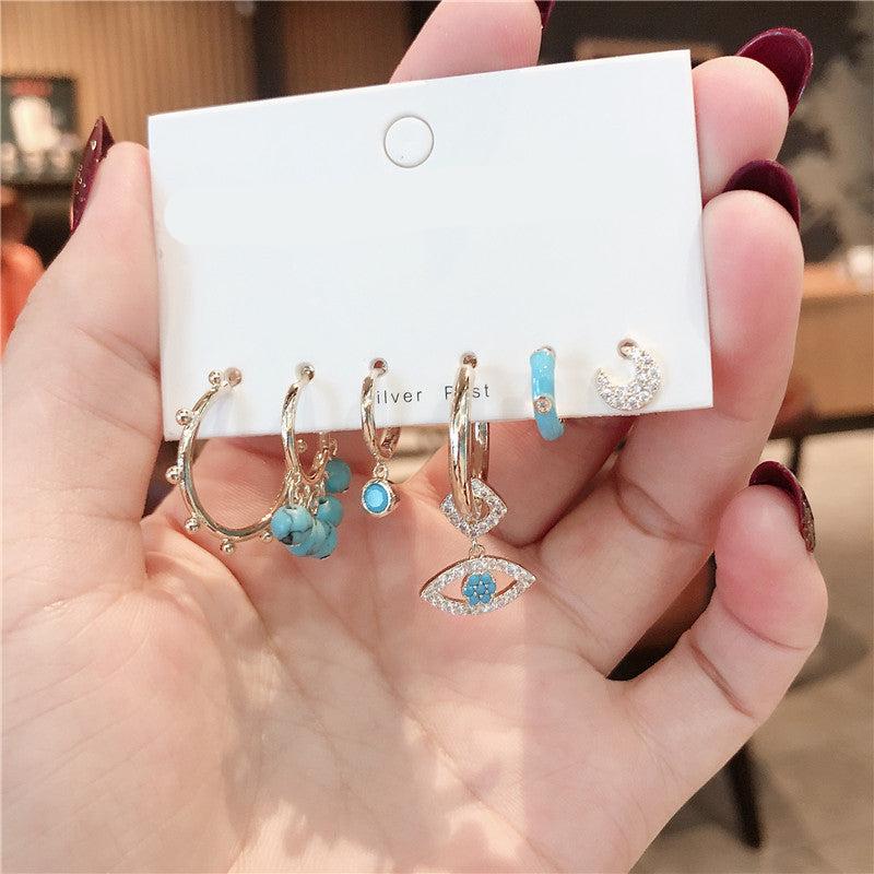 Vintage Devil's Eye Zircon Drop Earrings Set with Turquoise Studs and Hoops