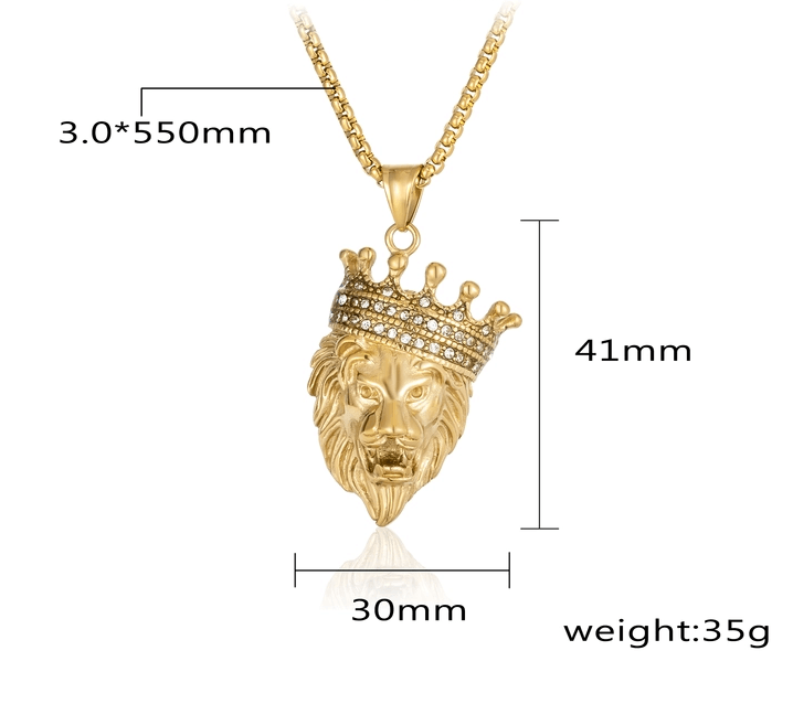 304 Stainless Steel Lion Pendant Necklace with Crown and Rhinestones - Modern Punk Style