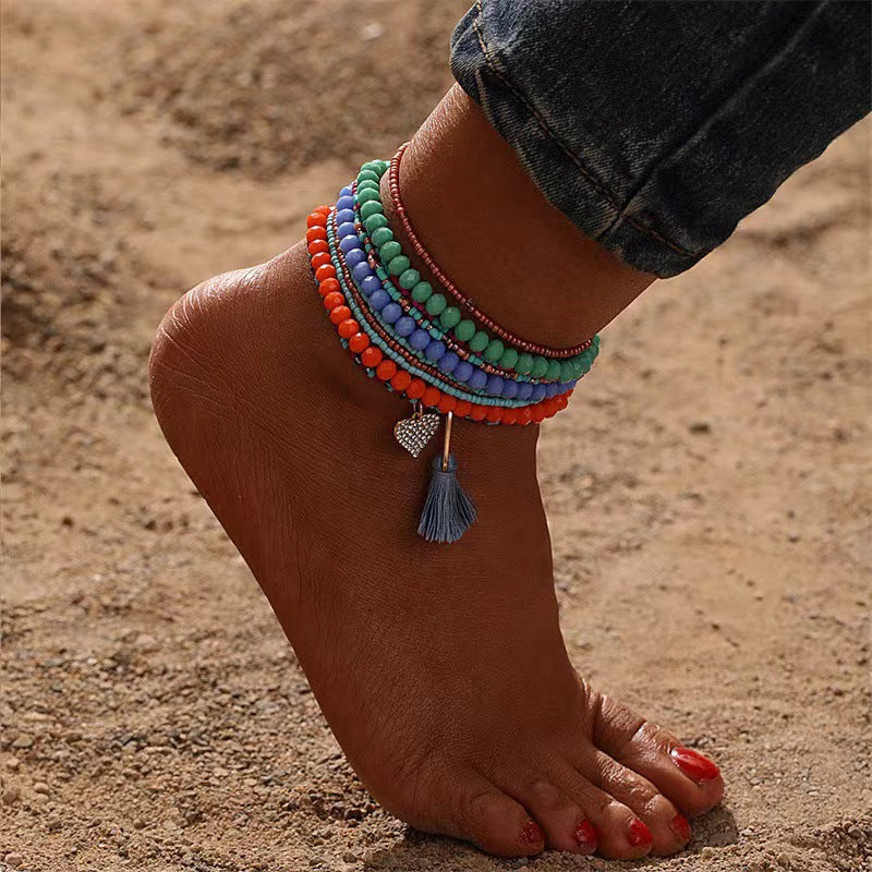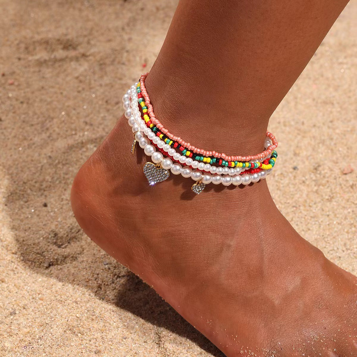 Beach Bohemian Heart Shape Beaded Rhinestone Anklet with Shell Pendant