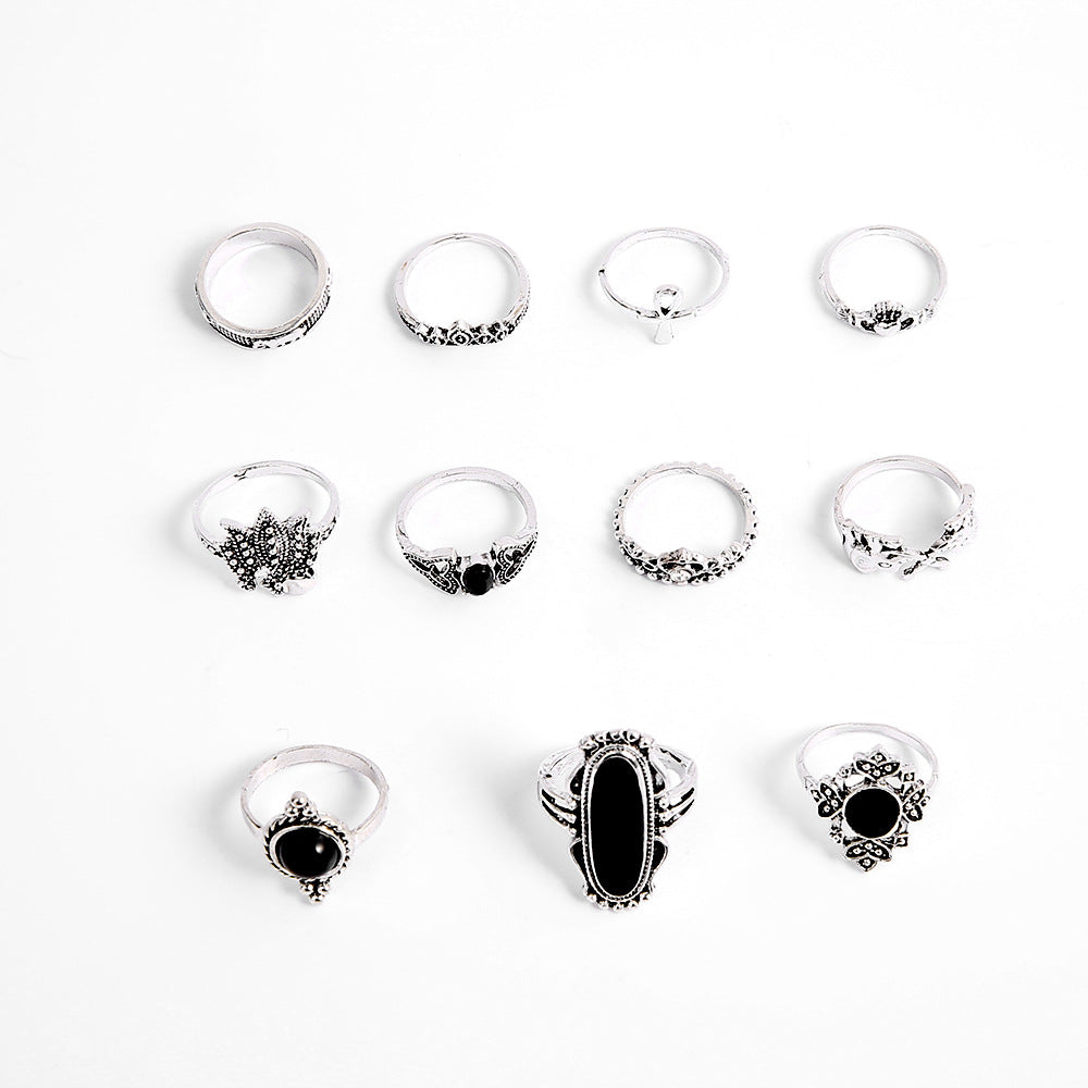 Bohemian Black Elephant Lotus Crown Ring Set - 11 Pieces
