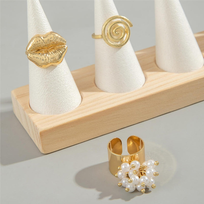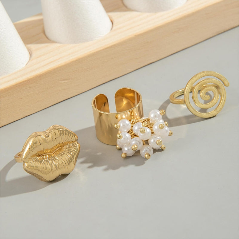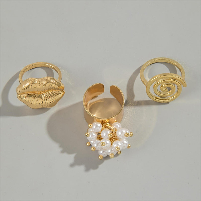 Elegant Pearl Inlay Lip Design Women's Ring Set - Vintage Gold Spiral Pattern Trio