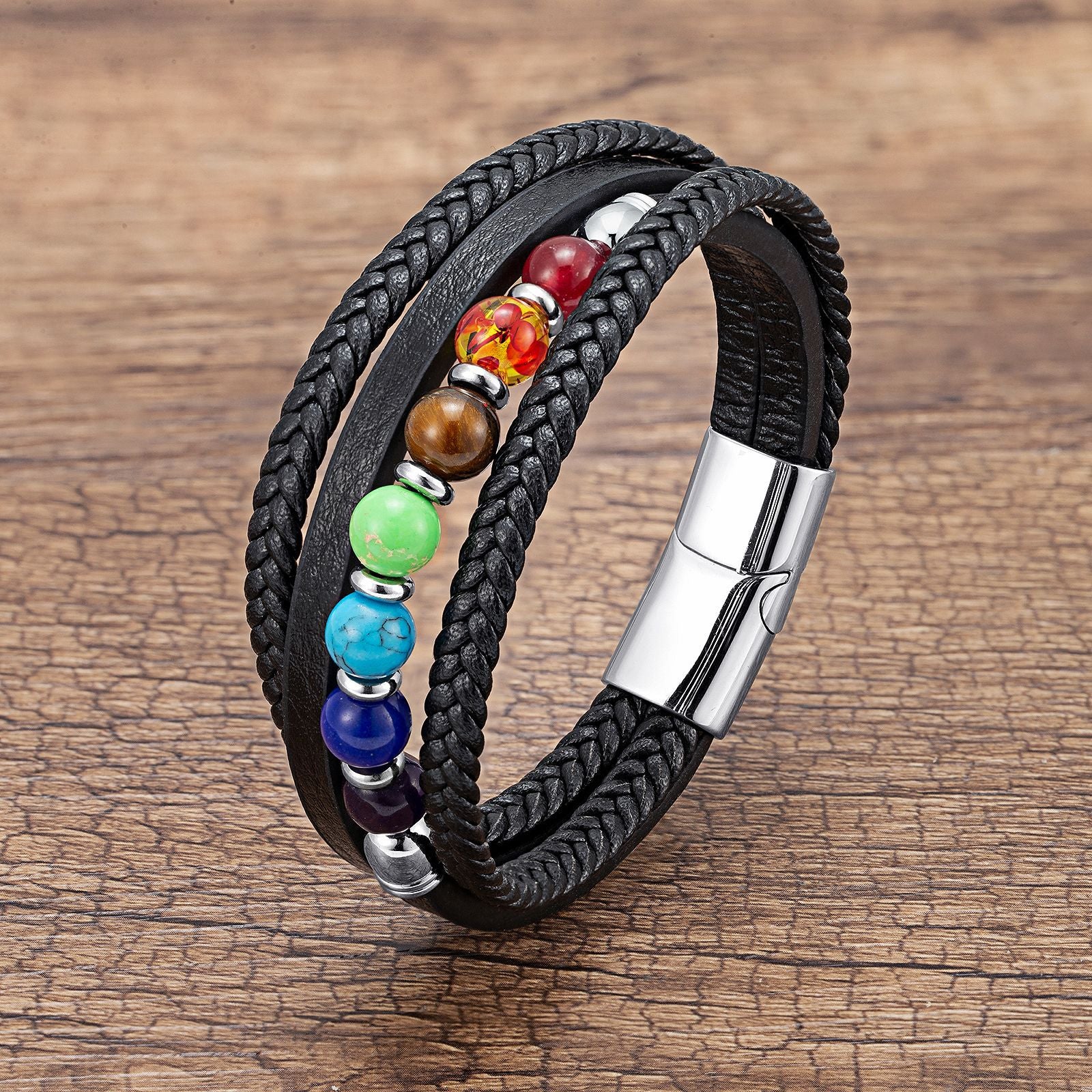 Casual Multi-Layer Leather Rope Chakra Beaded Men's Bracelet with Stainless Steel Clasp