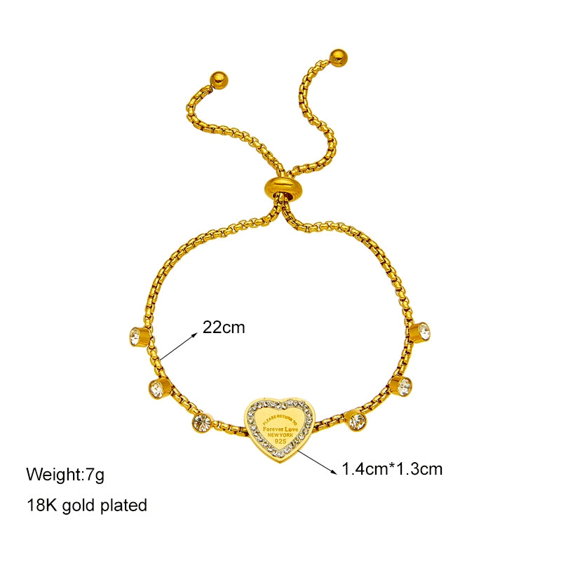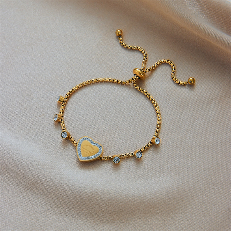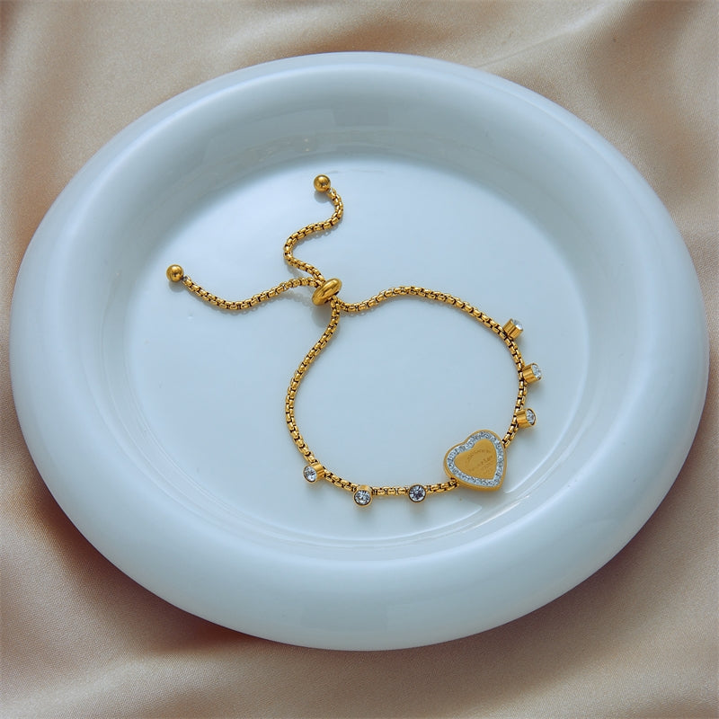 Vintage Heart Shape 18K Gold Plated Stainless Steel Rhinestone Adjustable Bracelet