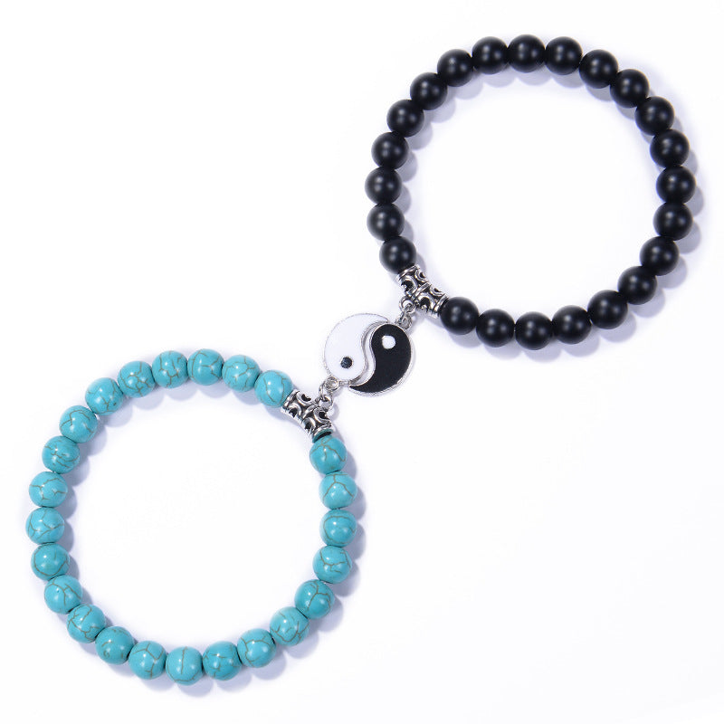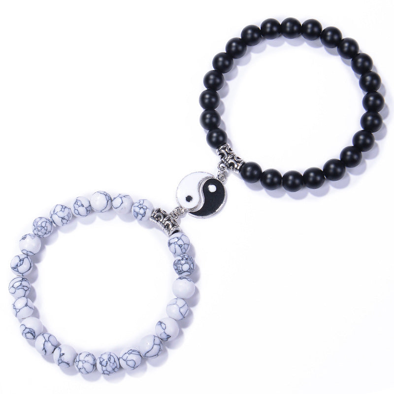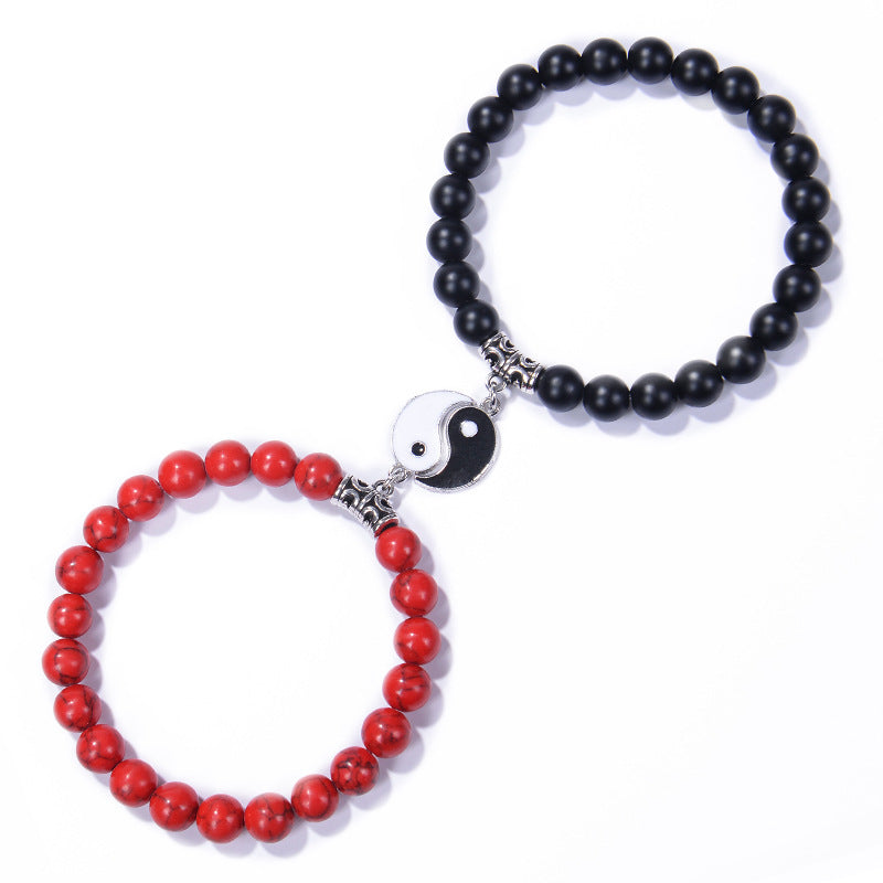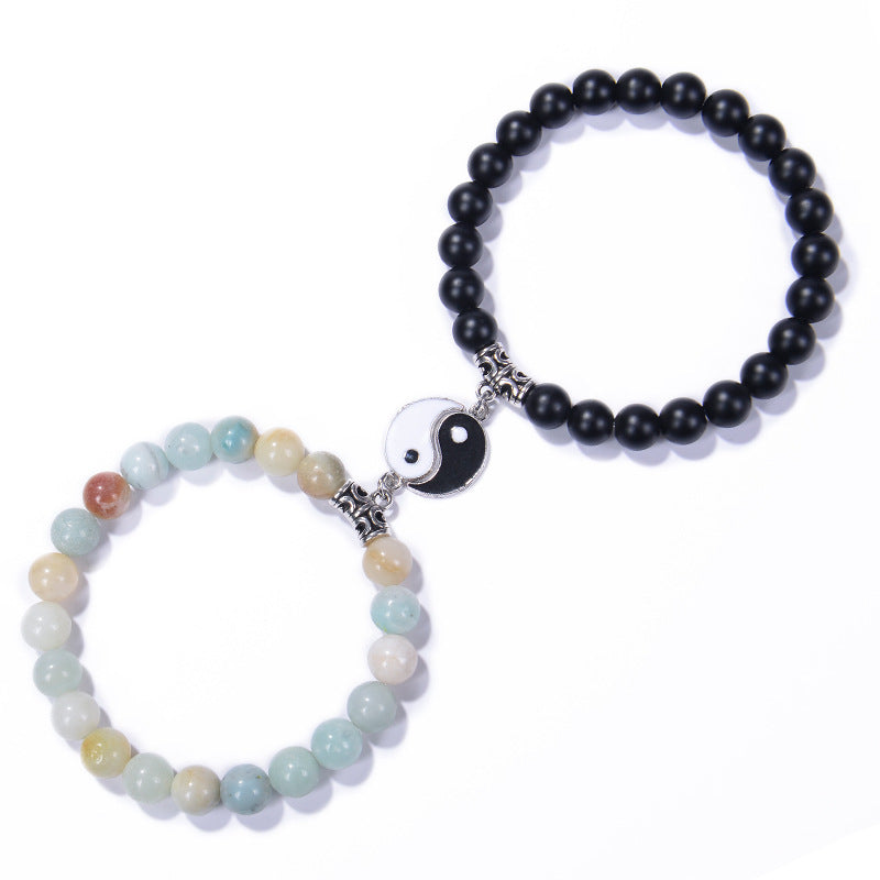 Chinoiserie Natural Stone Beaded Bracelets Set - 8mm Black Matte & Pink Crystal Yin Yang Design