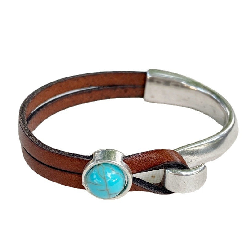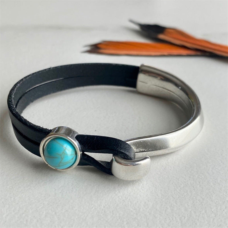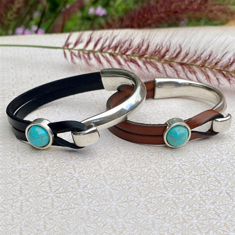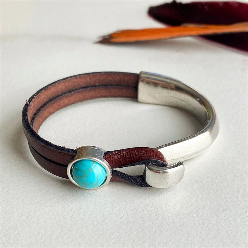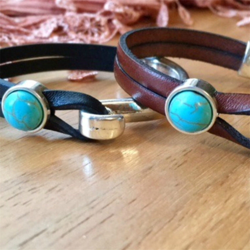 Commute Bohemian Turquoise Alloy Inlay Unisex Leather Bangle Bracelet
