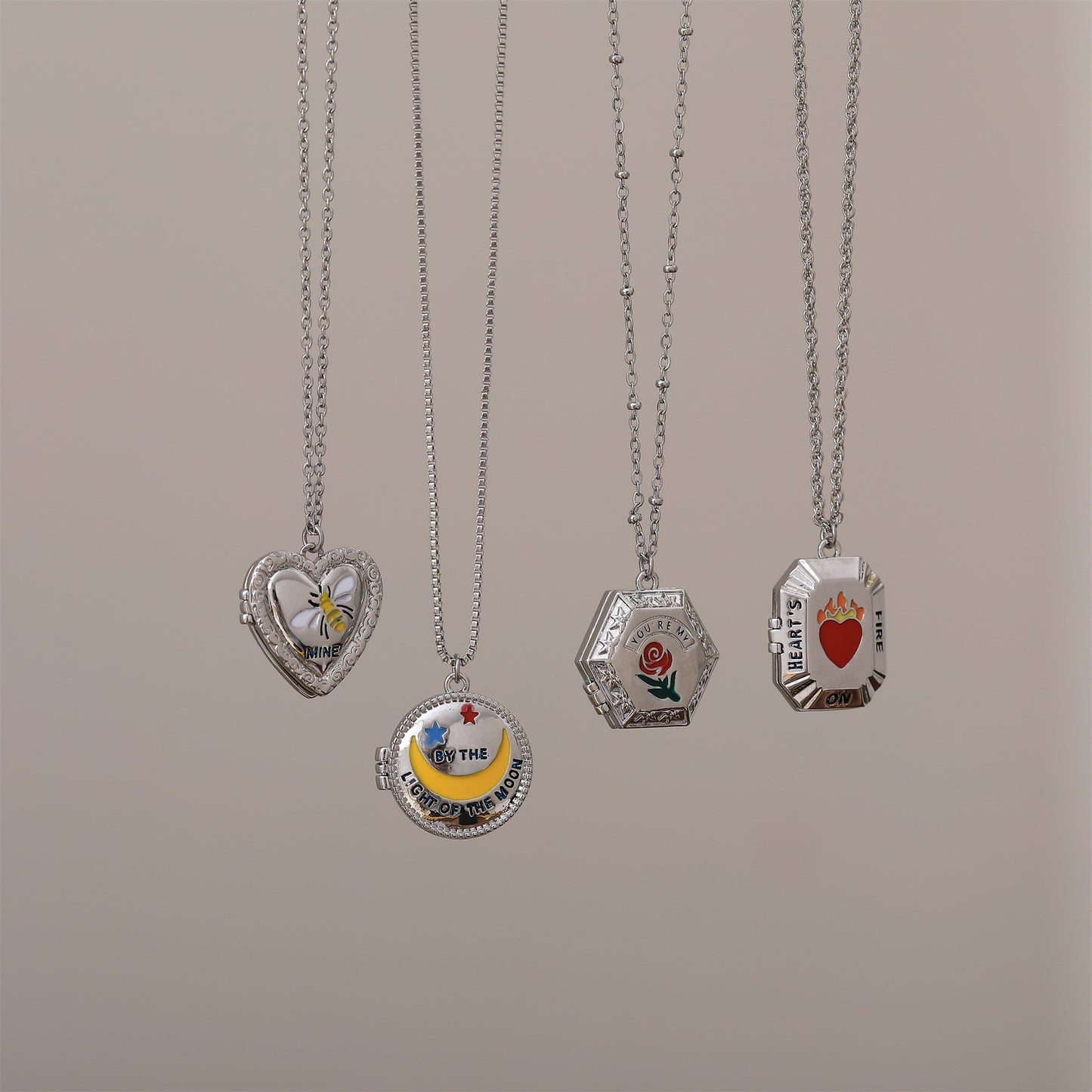 Copper Gold Plated Heart and Moon Photo Locket Necklace with Rose Flower Design