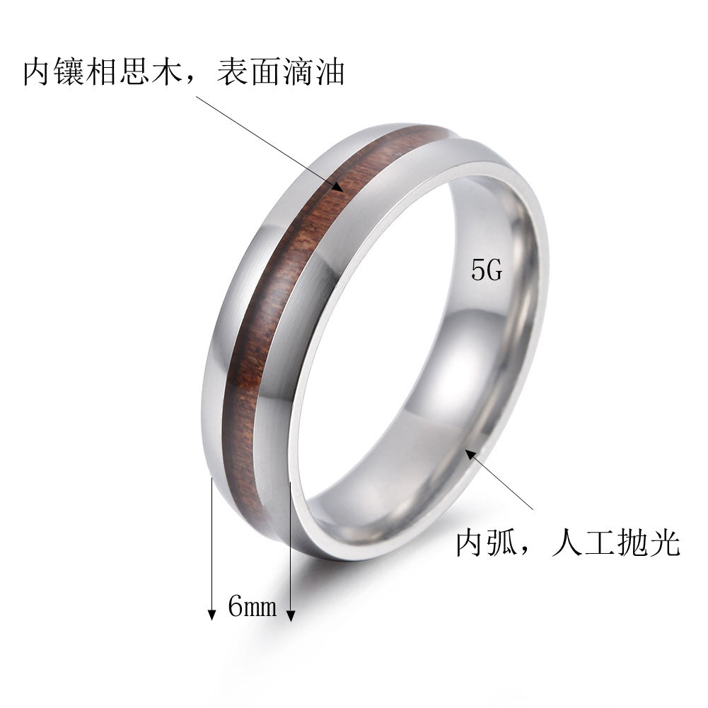 6mm Acacia Wood Inlaid Stainless Steel Ring - Black Wood Grain Design