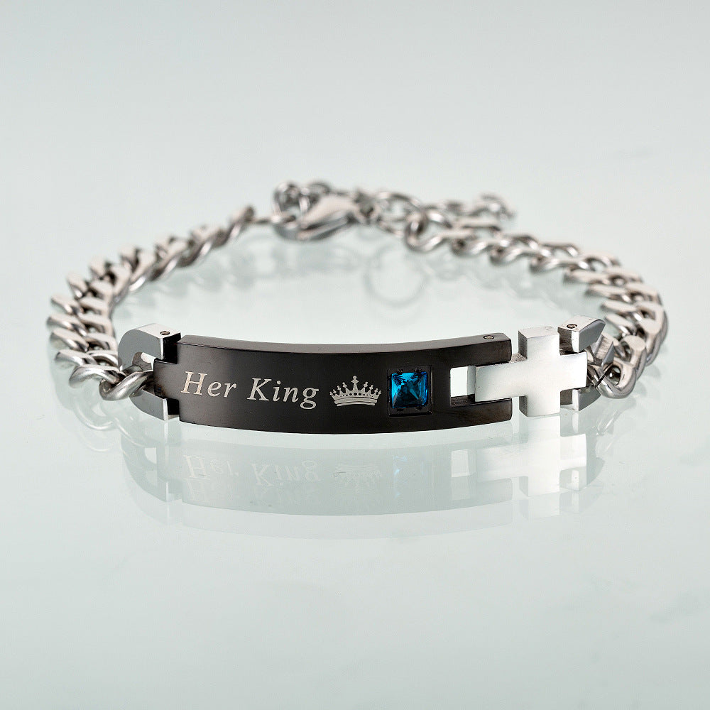 Titanium Steel Zircon Couple ID Bracelet with King Queen Crown Design