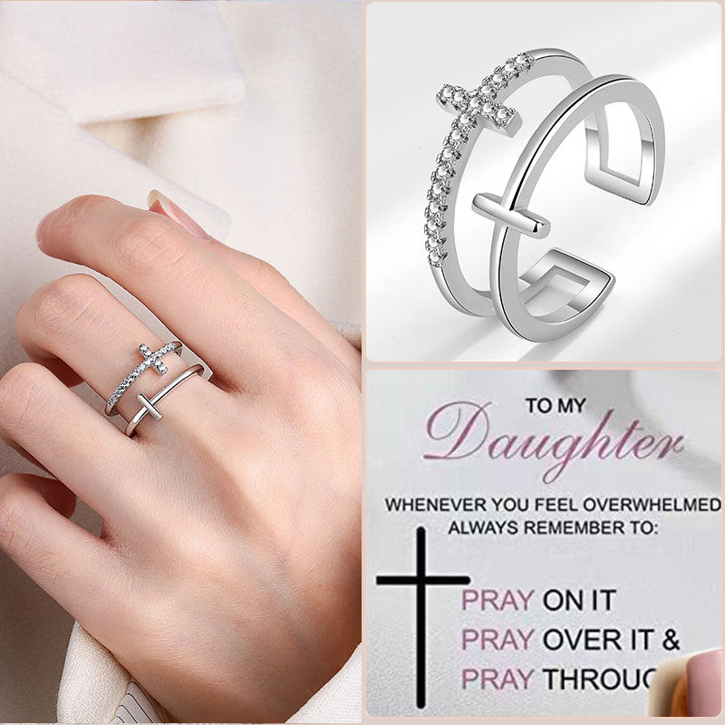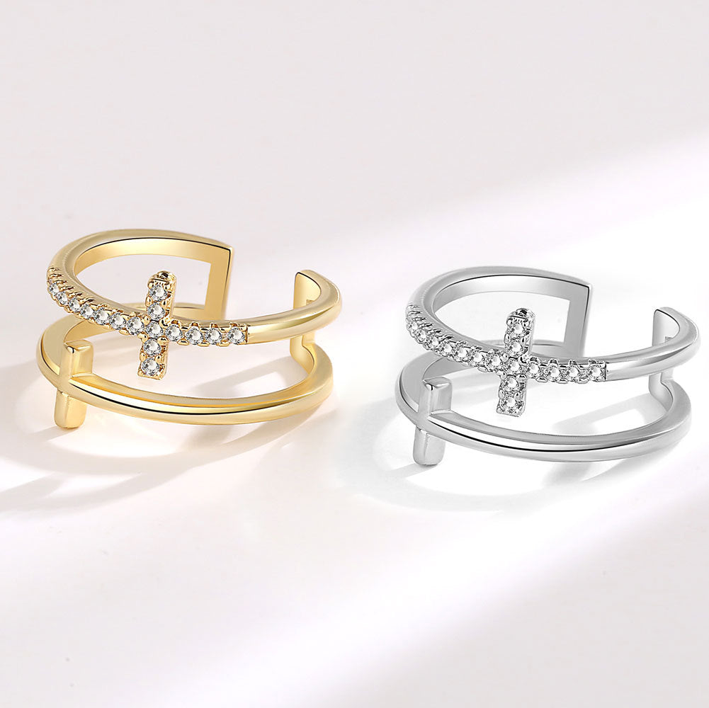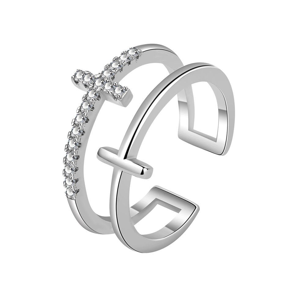 Elegant Double Layer Zircon Cross Open Ring in Sterling Silver Plating