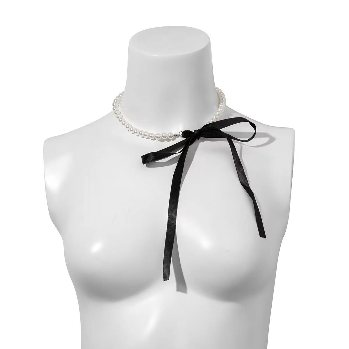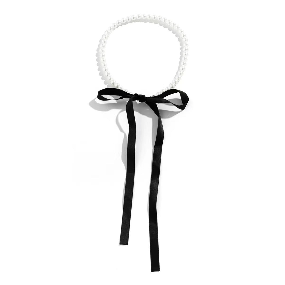 Elegant Geometric Baroque Pearl Choker Necklace with Black Ribbon Bow
