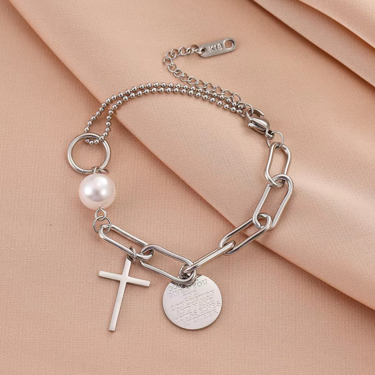 Elegant Streetwear Cross Stainless Steel Pearl Chain Bracelet