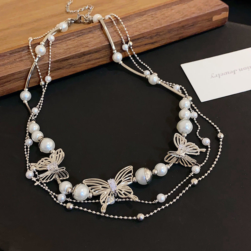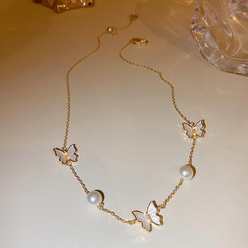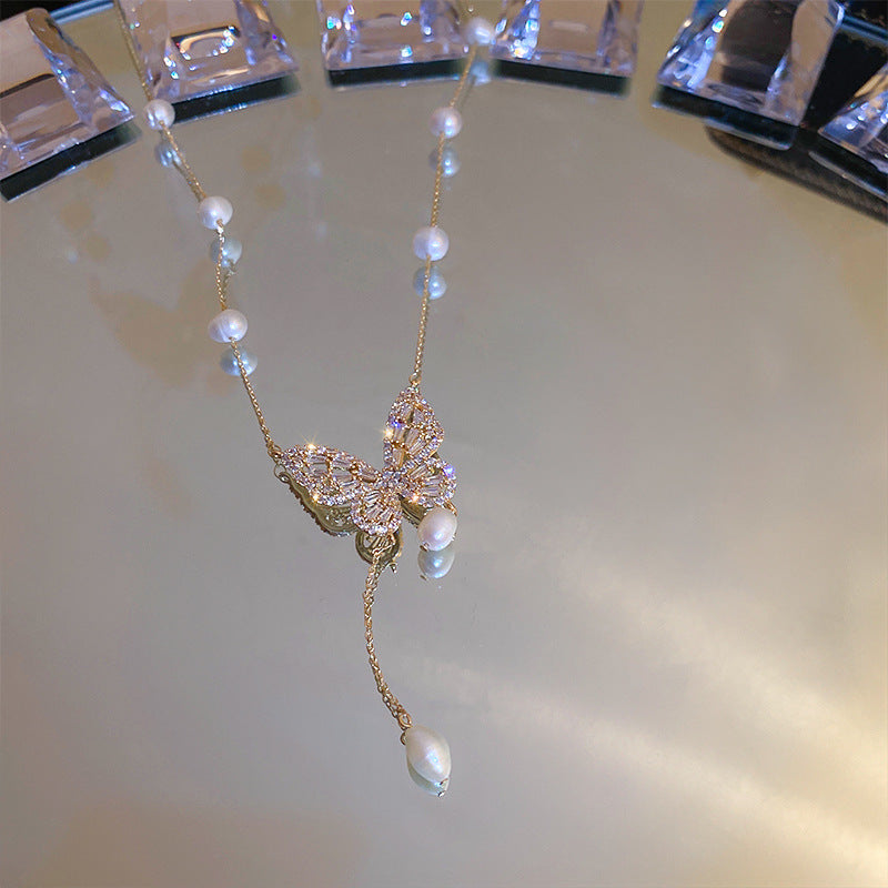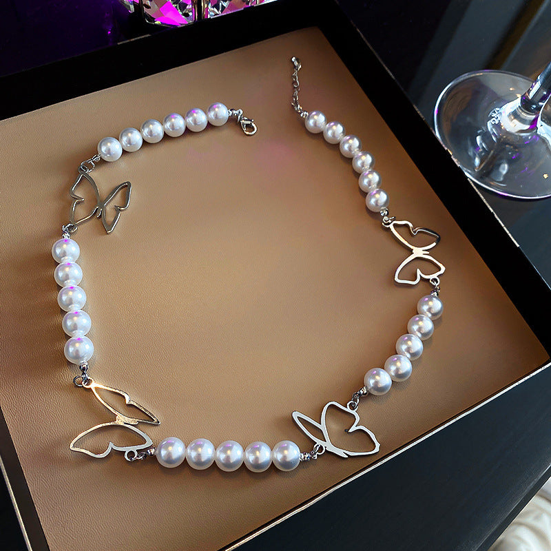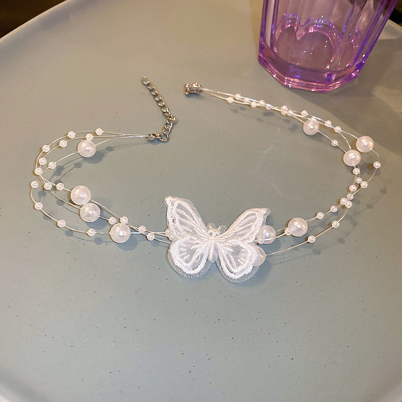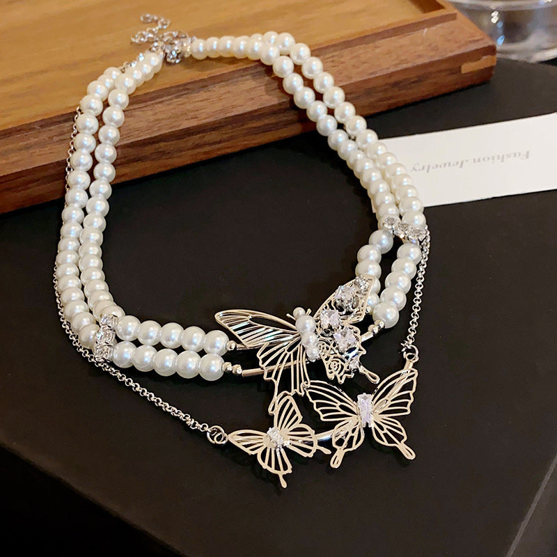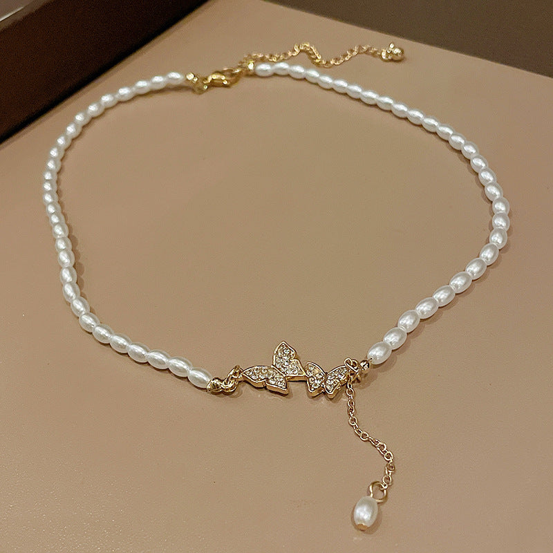 Elegant Korean Butterfly Rhinestone Pearl Choker Necklace