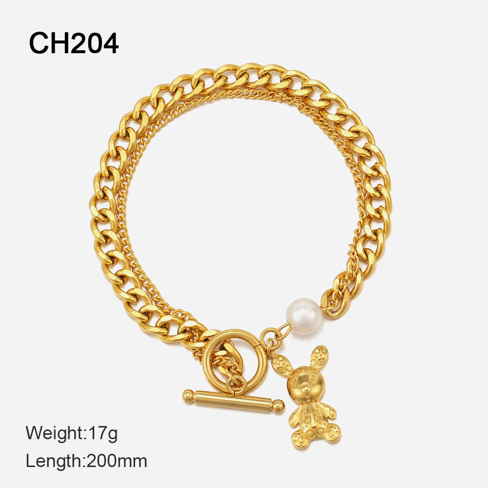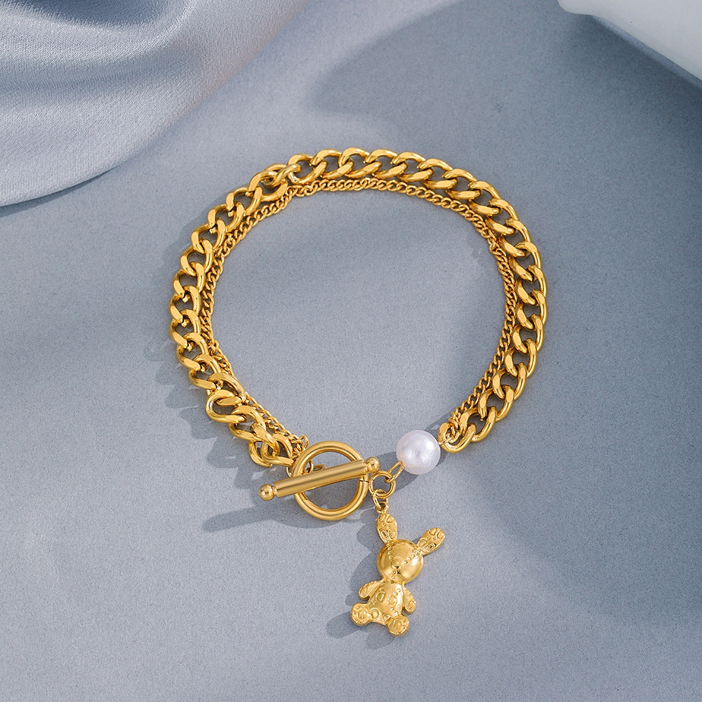 Fashion Double Layer Bear Stainless Steel 18k Gold Plated Pearl Bracelet