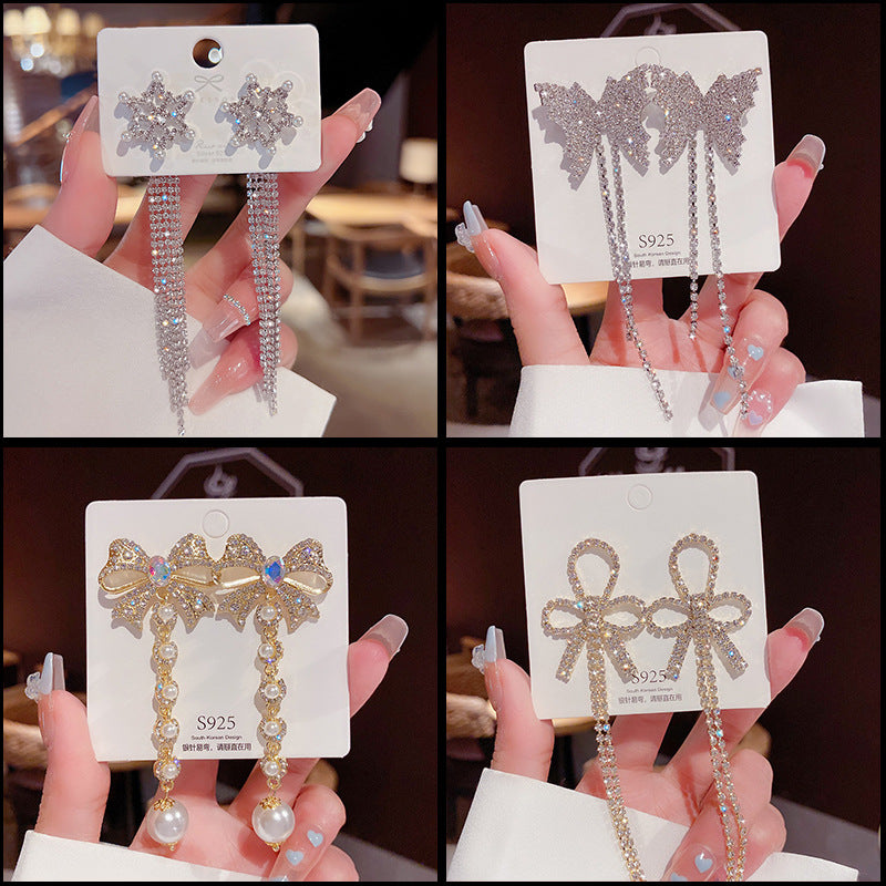 Fashion Star Tassel Zircon Drop Earrings with Butterfly Bow and Artificial Pearls