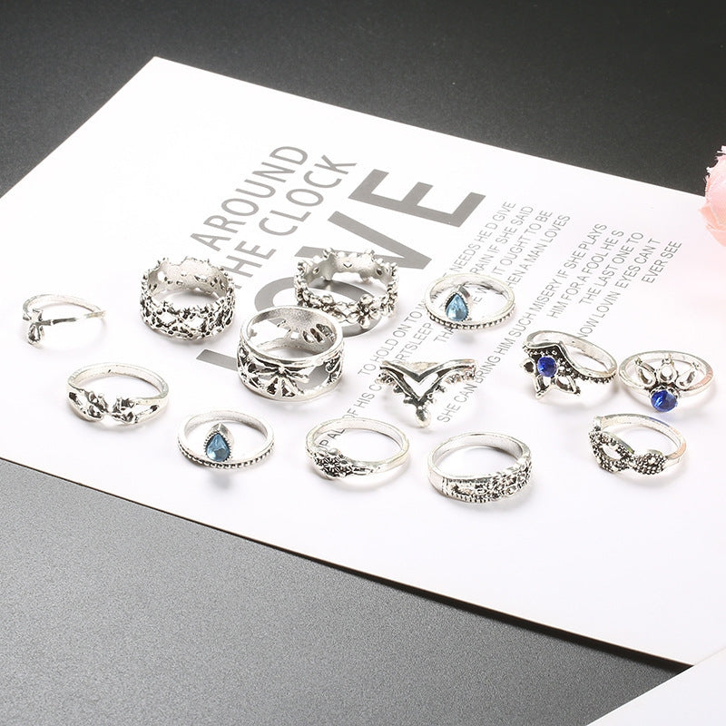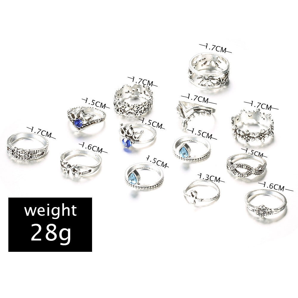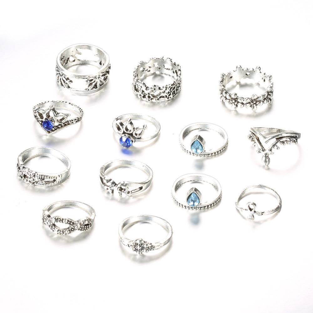 Fashion Geometric Alloy Plated Gemstone Women's Ring Set - Vintage Unicorn Lotus Design, 13 Pieces