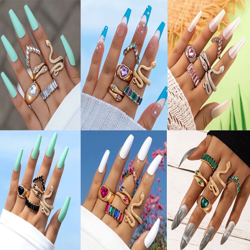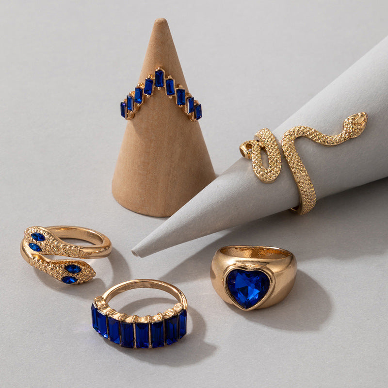 Heart Shape Snake Rhinestone Ring Set - Unisex, 5 Pieces