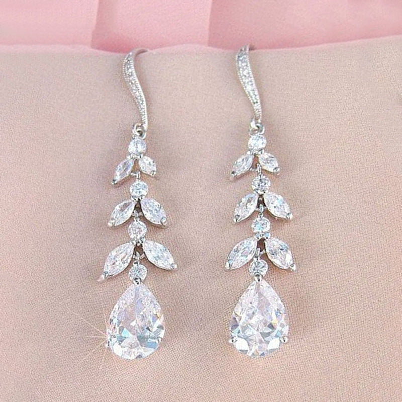 Elegant Tassel Teardrop Zircon Leaf Bridal Copper Earrings