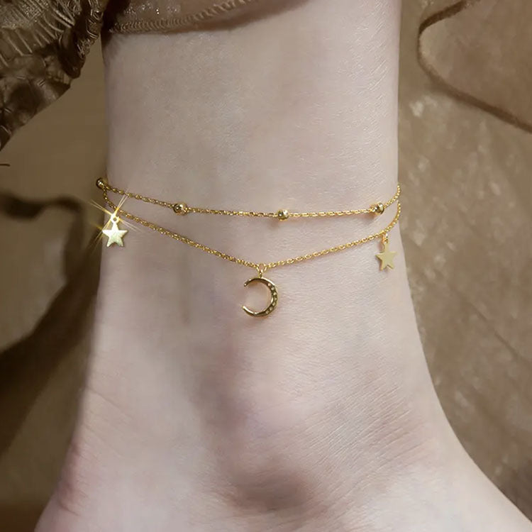 Fashion Titanium Steel Butterfly & Sterling Silver Star Moon Layered Anklet Bracelet