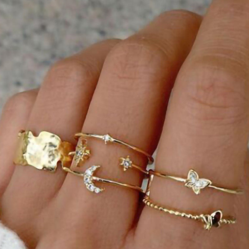Fashion Triangle Heart & Butterfly Diamond Ring 5-Piece Set - Creative Retro Design