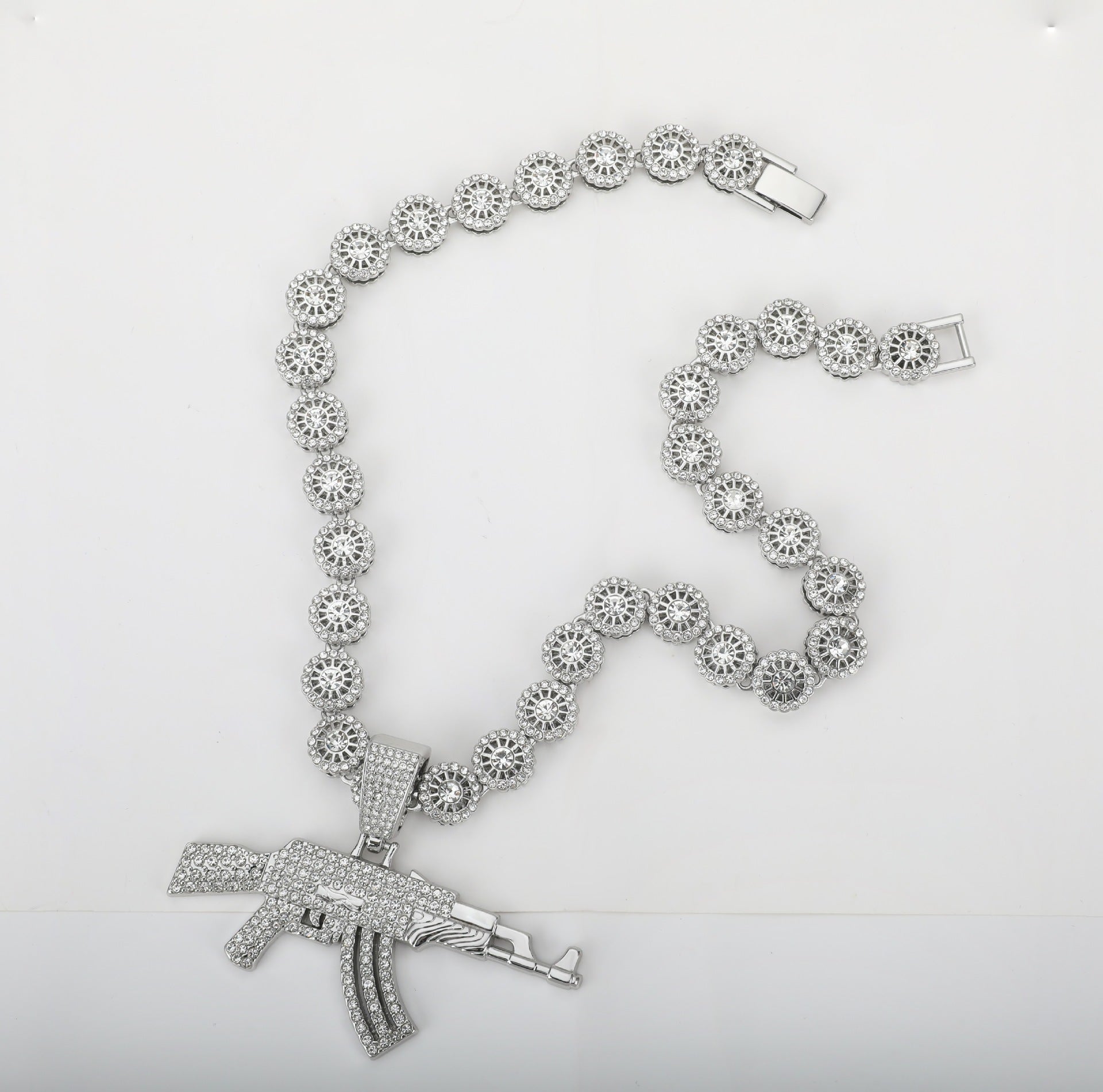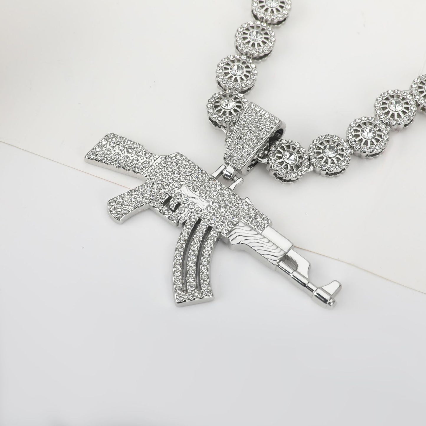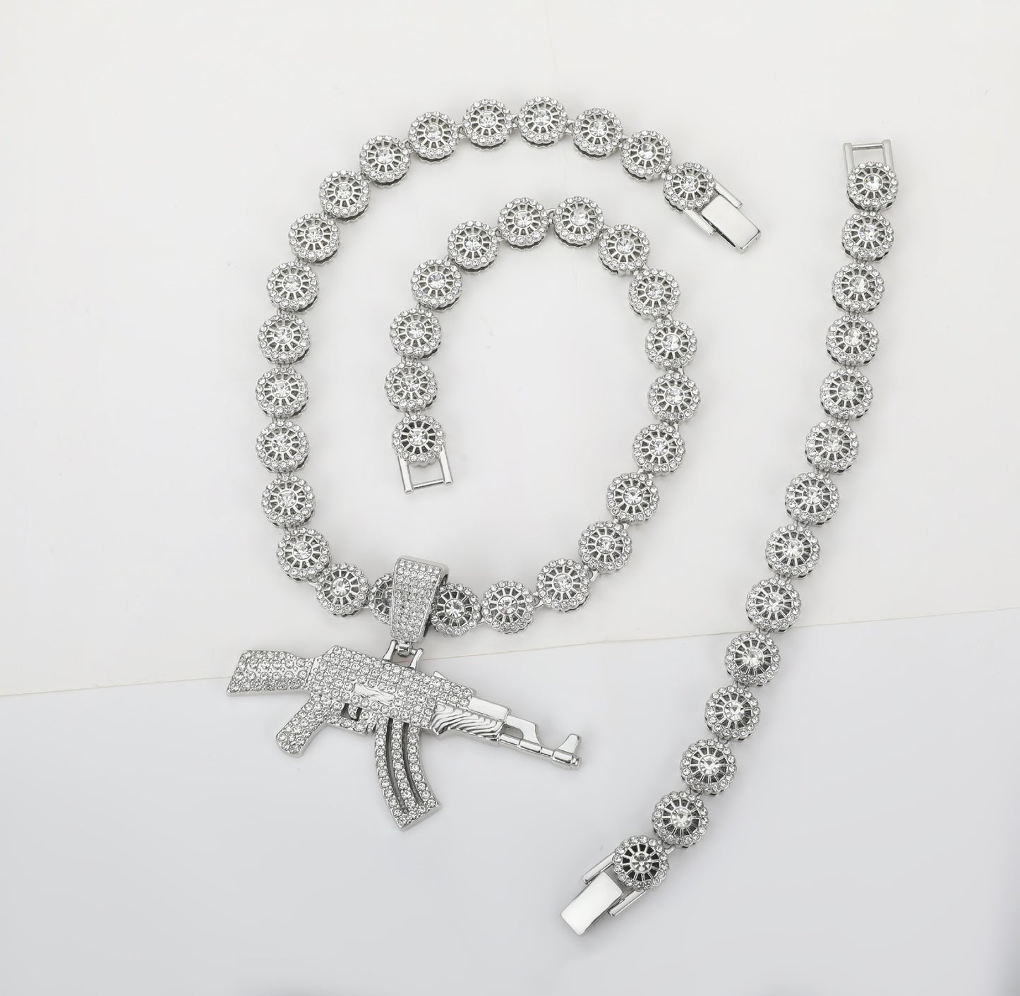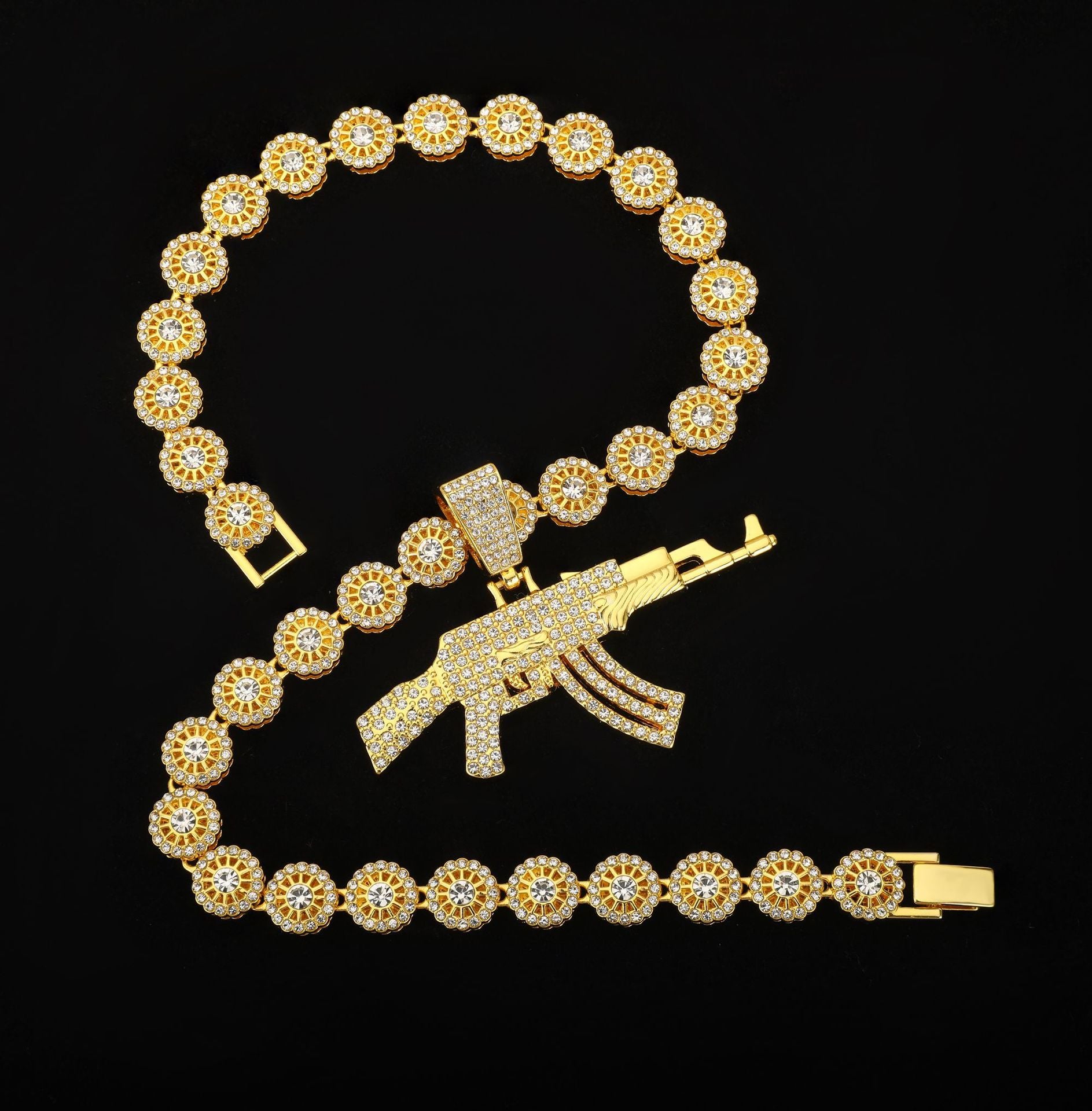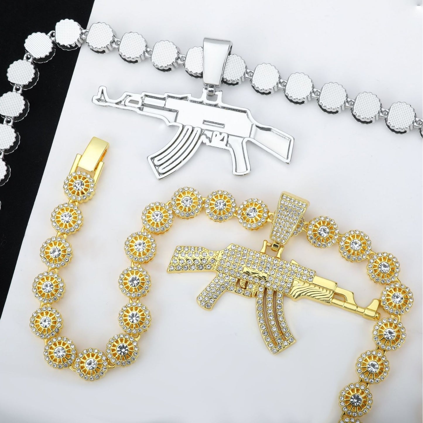 Hip-Hop Rhinestone Inlay Gun Pendant Cuban Link Necklace Jewelry Set