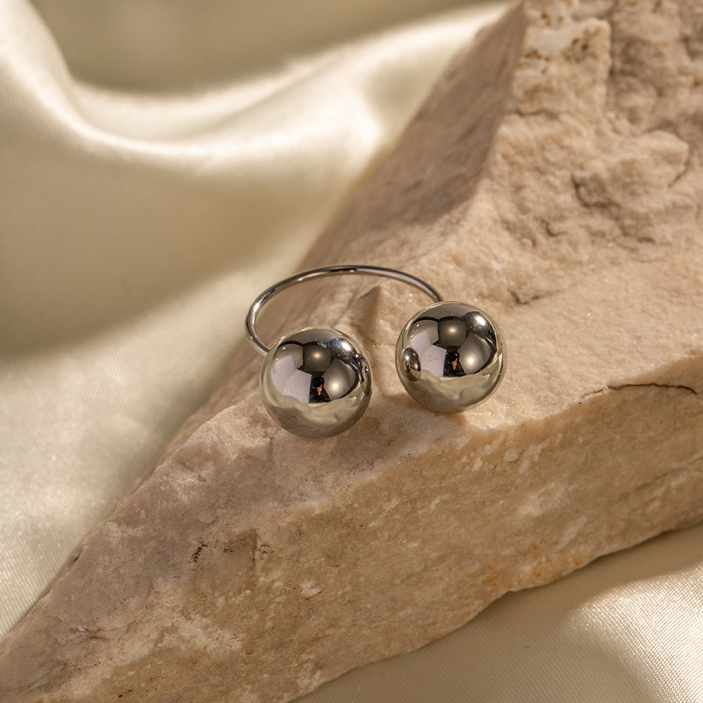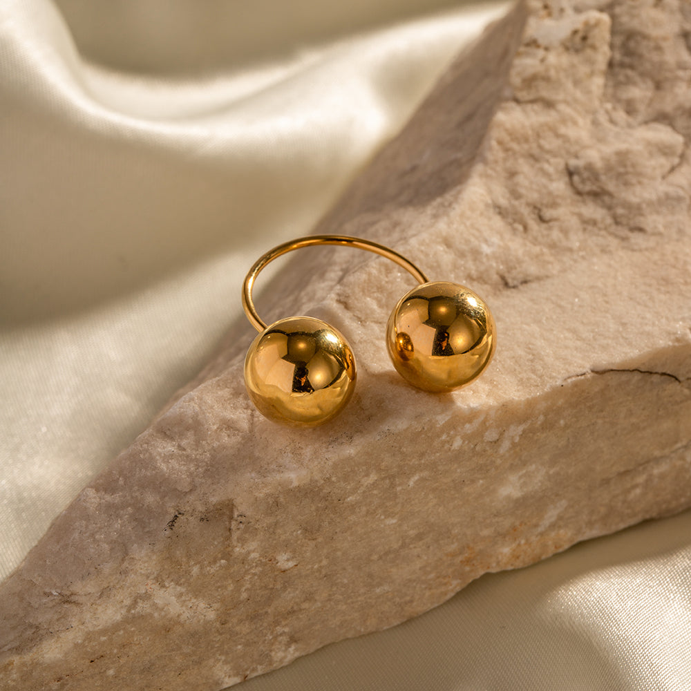 INS Style 18K Gold Plated Stainless Steel Open Ring with Dual Ball Design